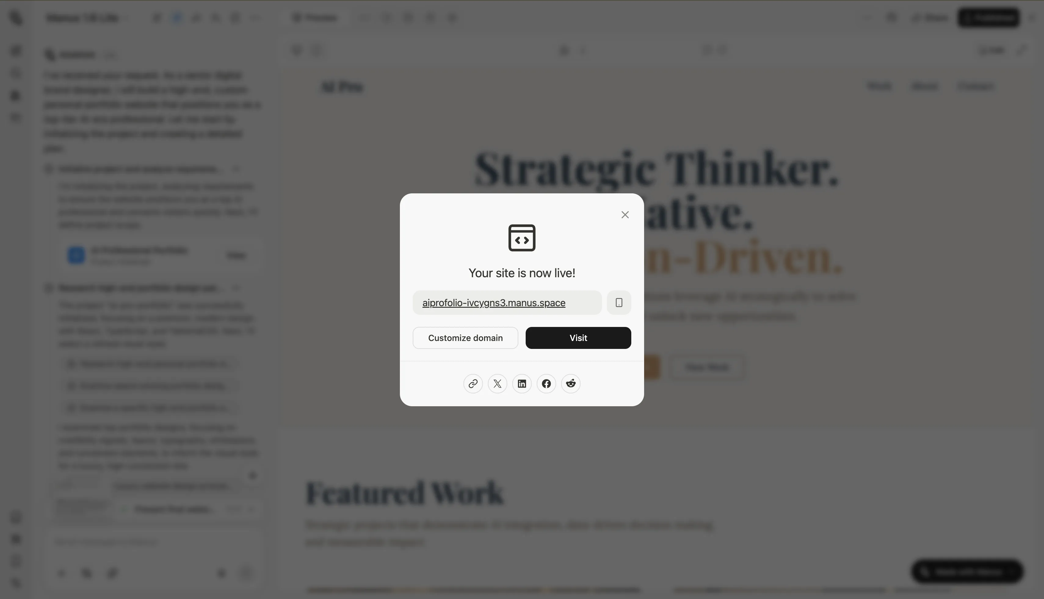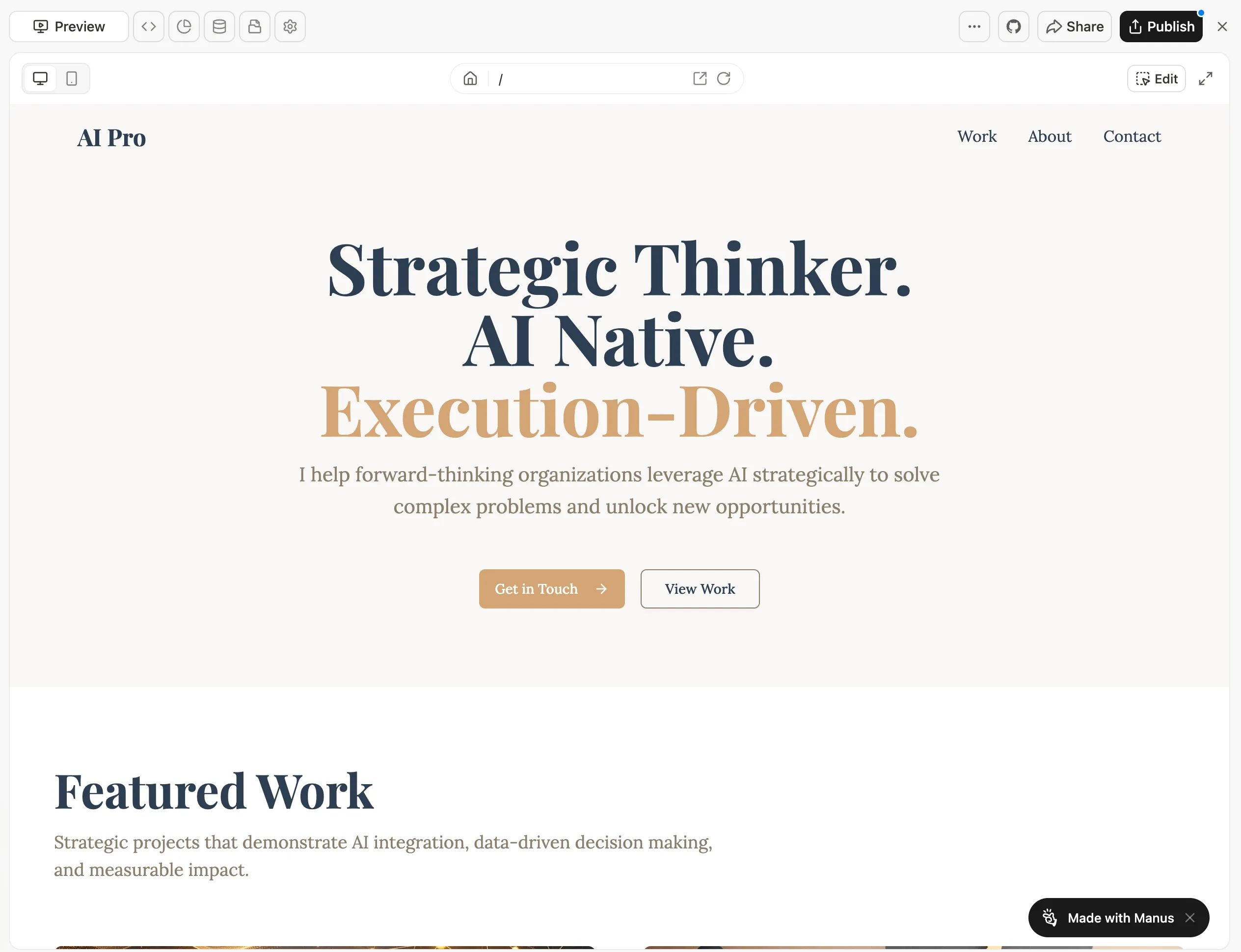 Free publishing is rare. Most tools require paid plans to connect custom domains. Manus stands out by including free publishing, eliminating the paywall between you and a live portfolio.