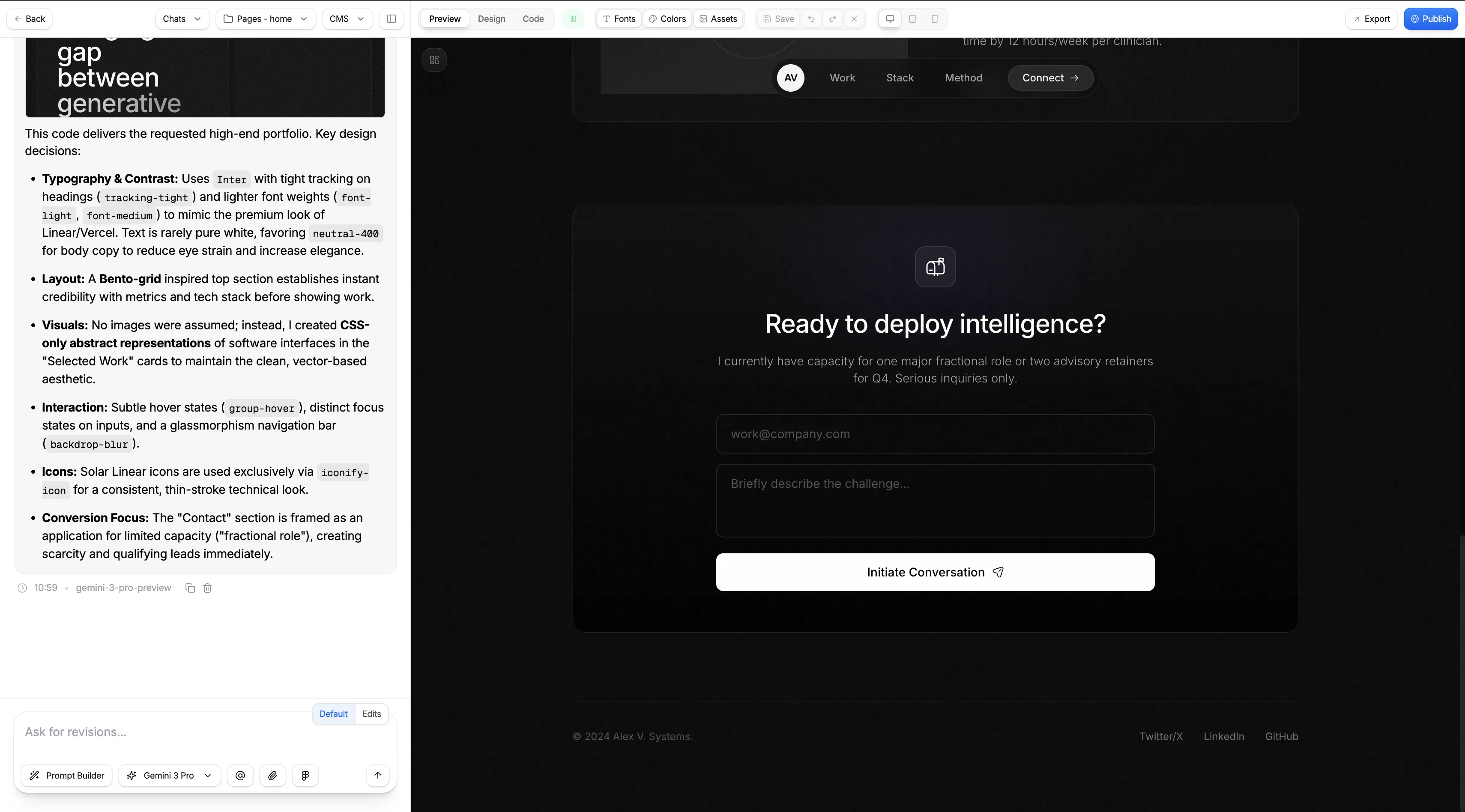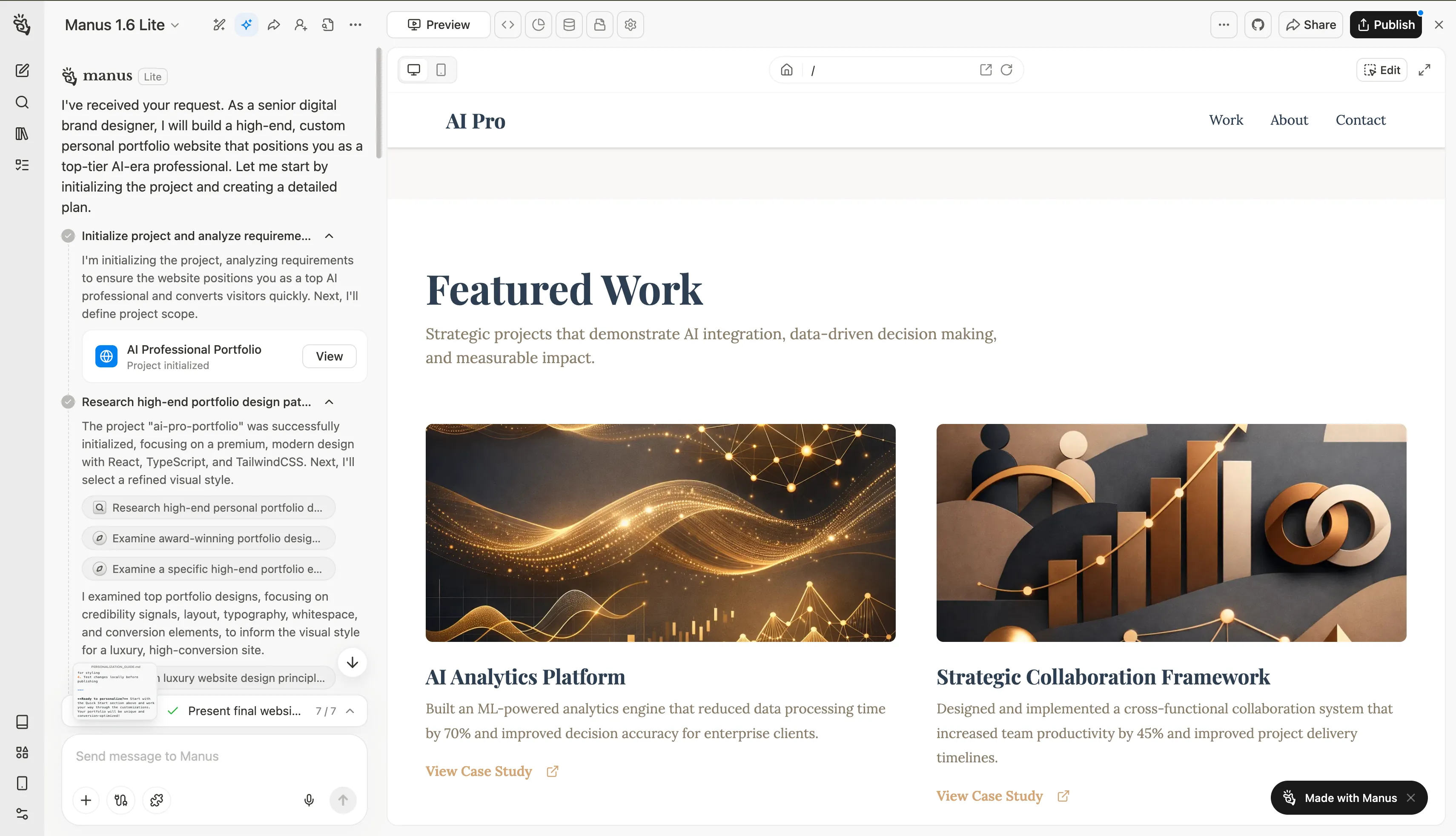Manus approached the portfolio brief like an actual senior designer would, by researching luxury design principles before building anything.