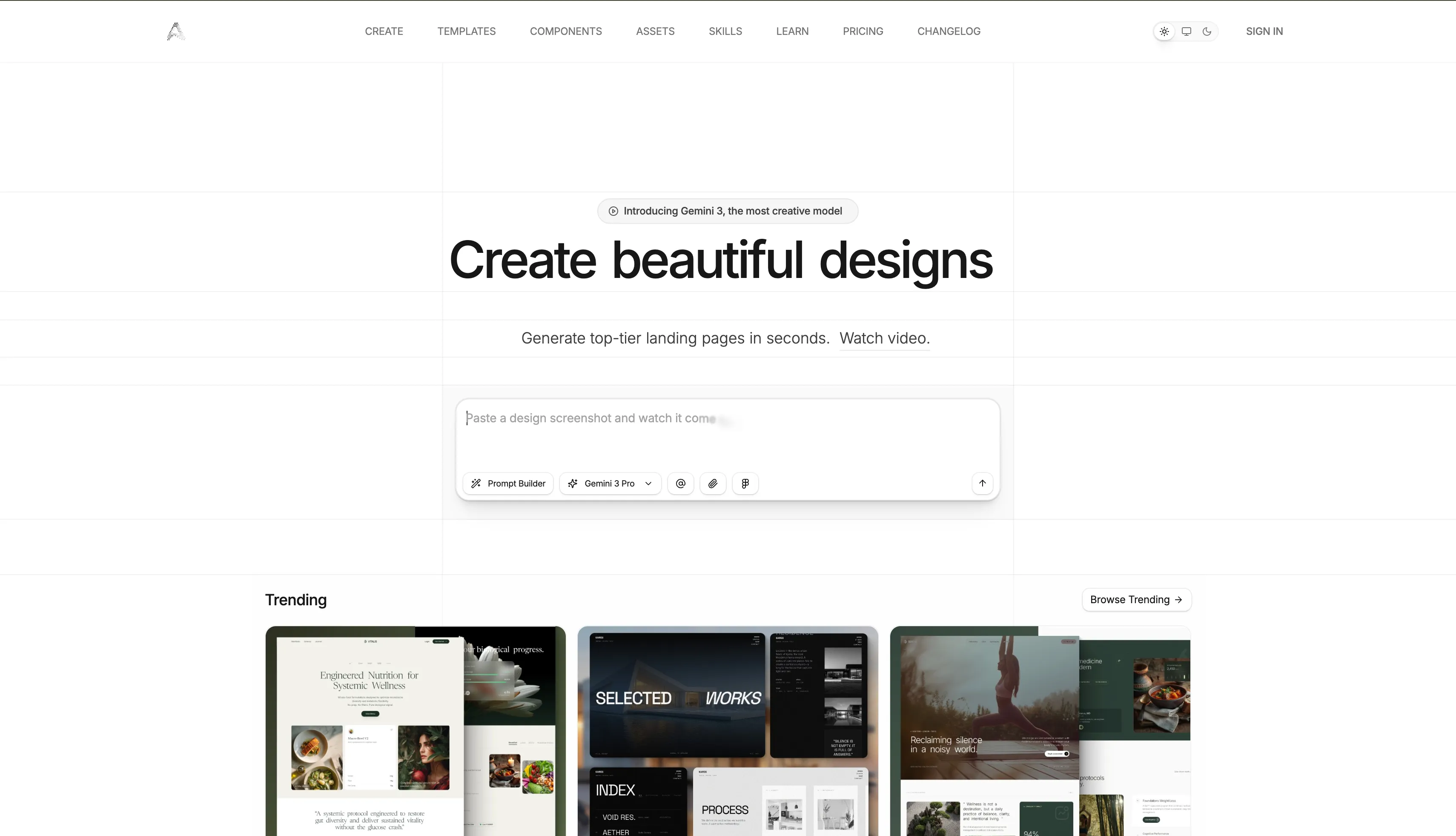 Replit's response to our prompt was immediately distinctive. It built with editorial serif headlines, clean modern UI type, generous whitespace, glass depth effects, subtle grain textures, and tight motion animations.