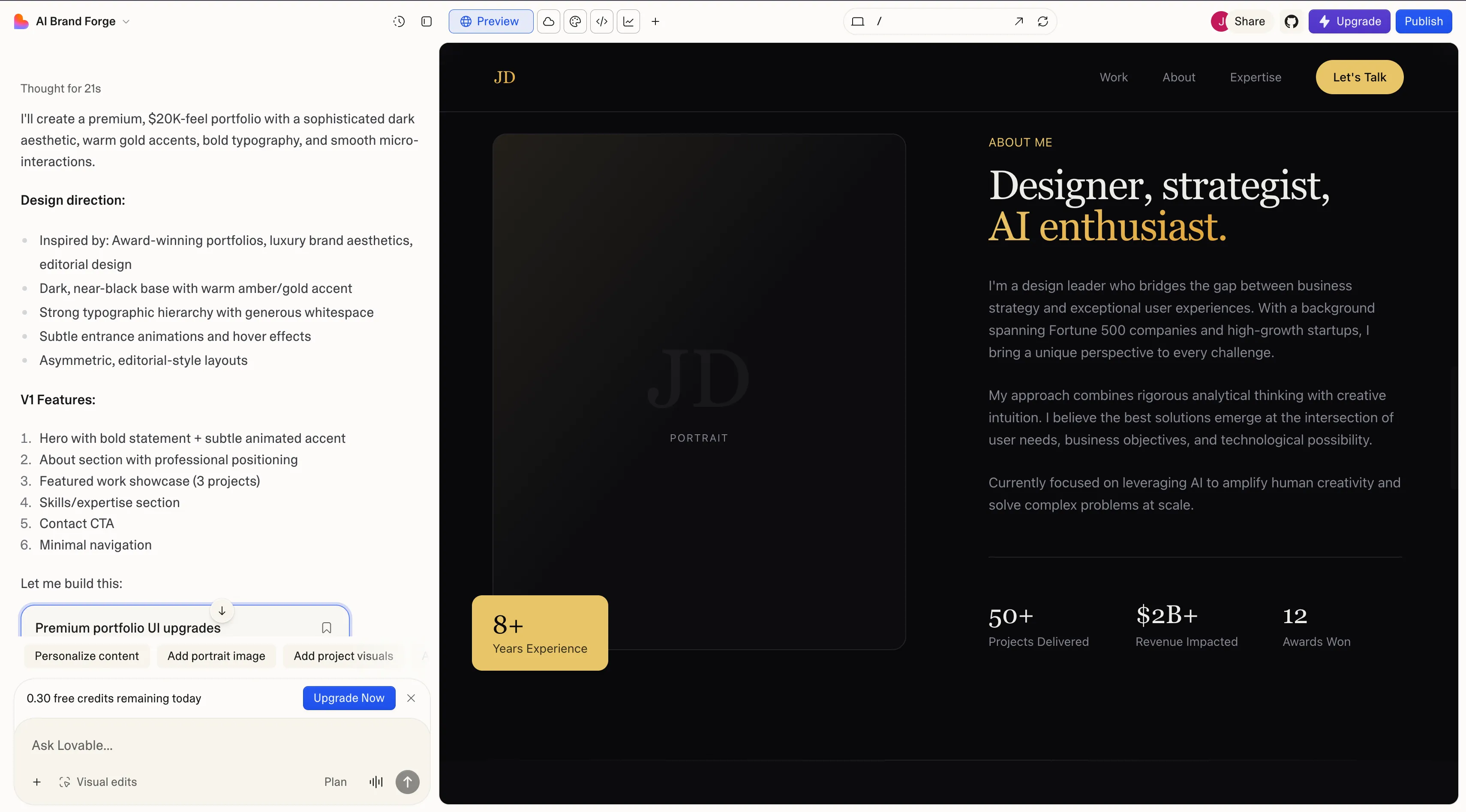 It first analyzed requirements, examined top portfolio designs for credibility signals, and created a brainstorm document with three distinct stylistic approaches before settling on "Sophisticated Elegance."