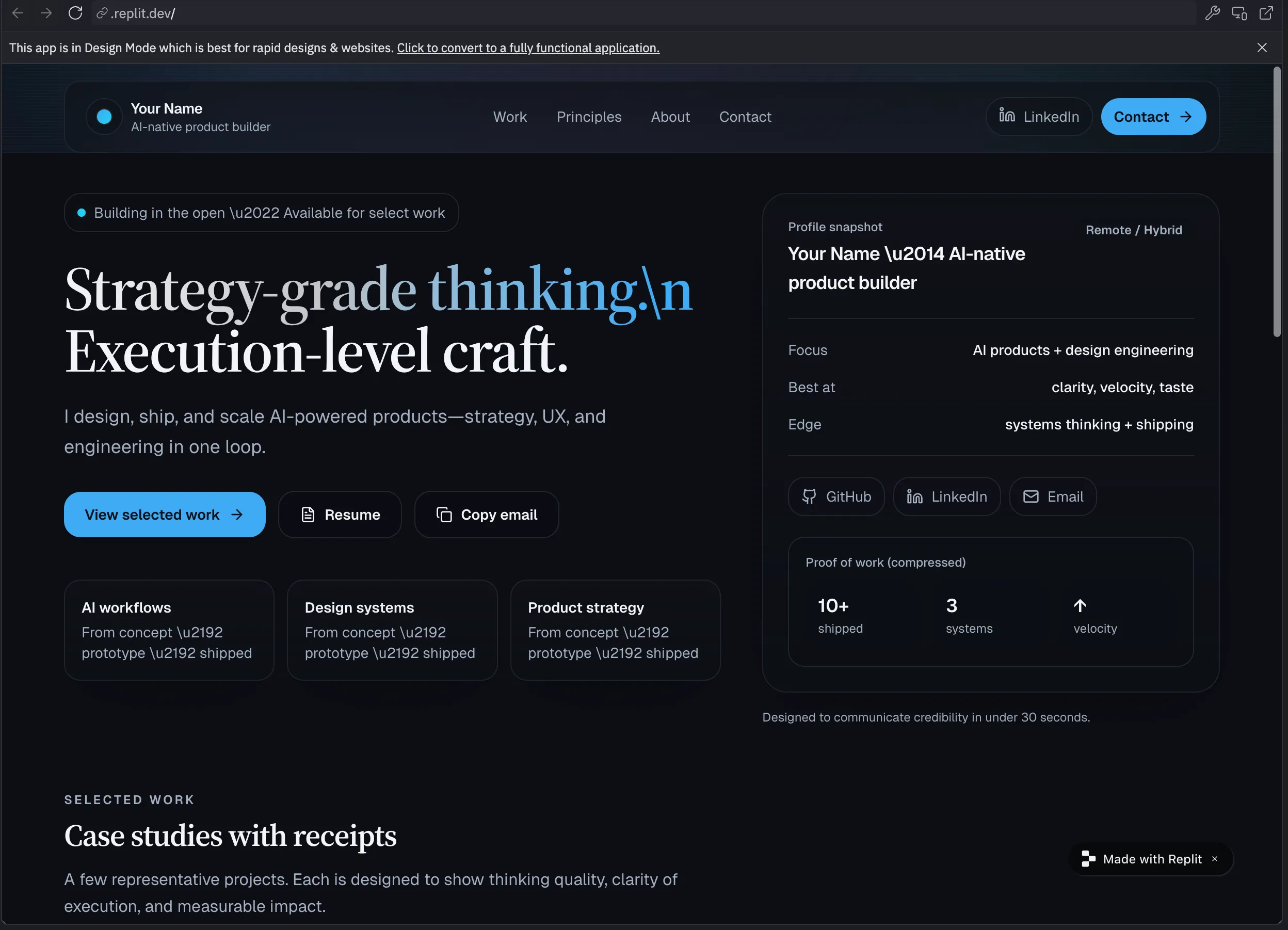 Replit's AI created what it called "Dark Precision / AI-era luxury", an editorial aesthetic that feels more like a premium tech magazine than a portfolio template.