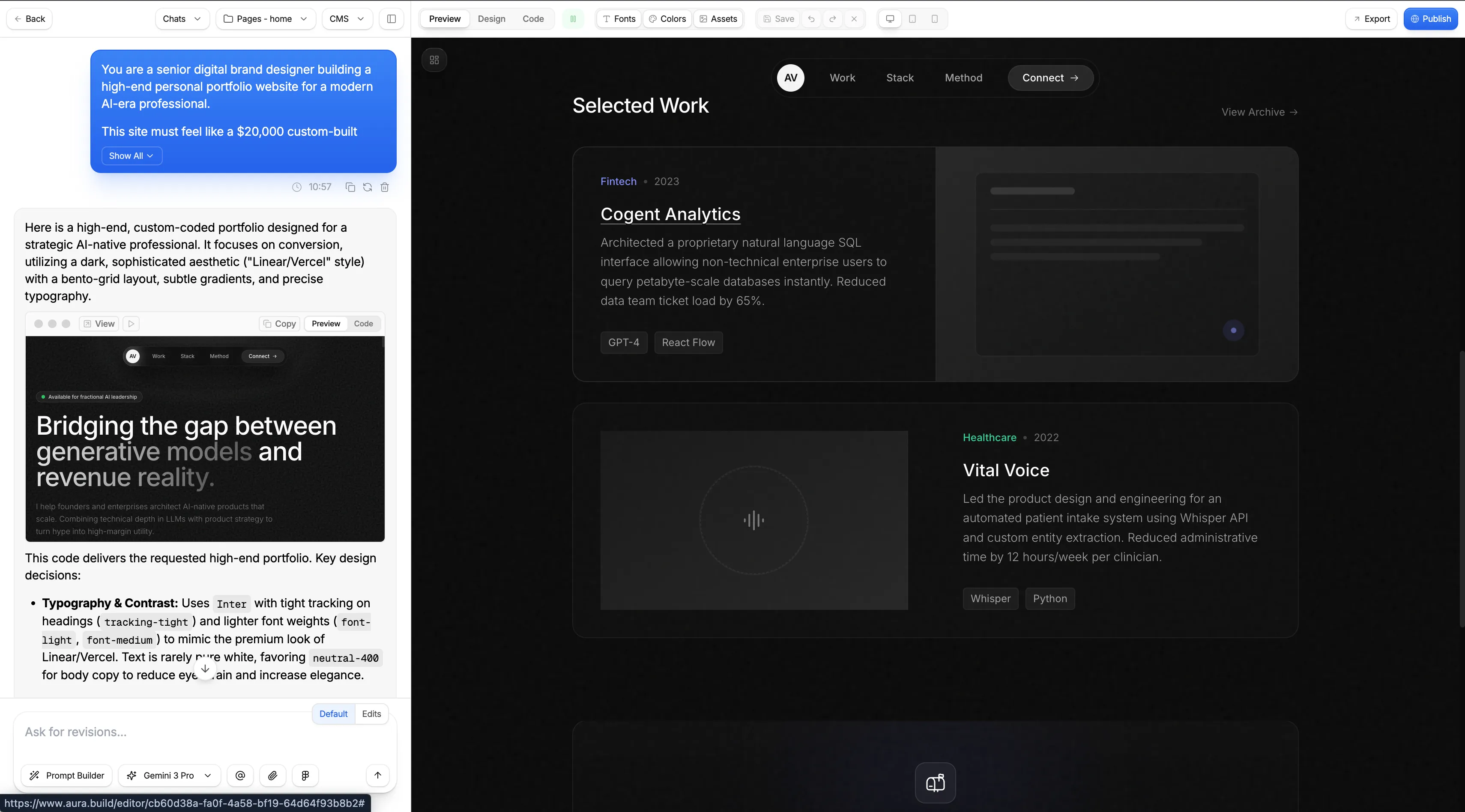 Aura delivered exactly what it promised: a high-end, custom-coded portfolio with the sophisticated dark aesthetic popularized by companies like Linear and Vercel.