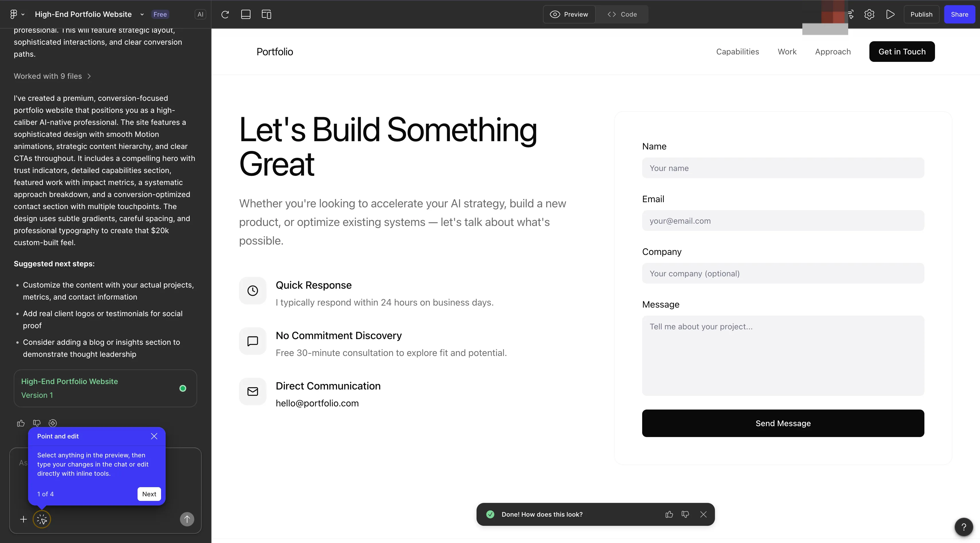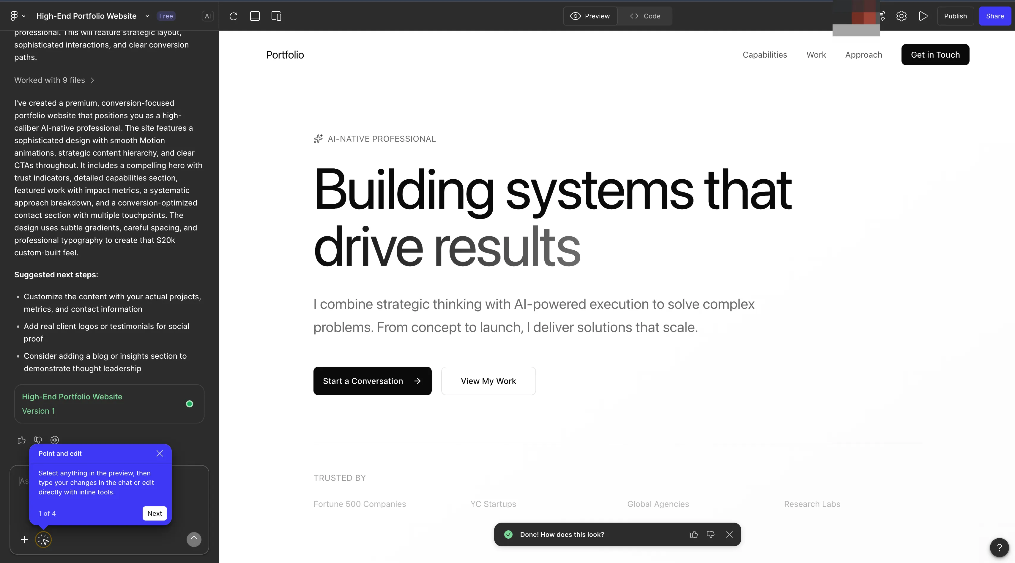 The best tools get surprisingly close. Manus and Replit produce output that would cost thousands from a boutique agency. However, you'll still need to customize content with your actual work, metrics, and personality. AI handles design and structure; you provide substance.