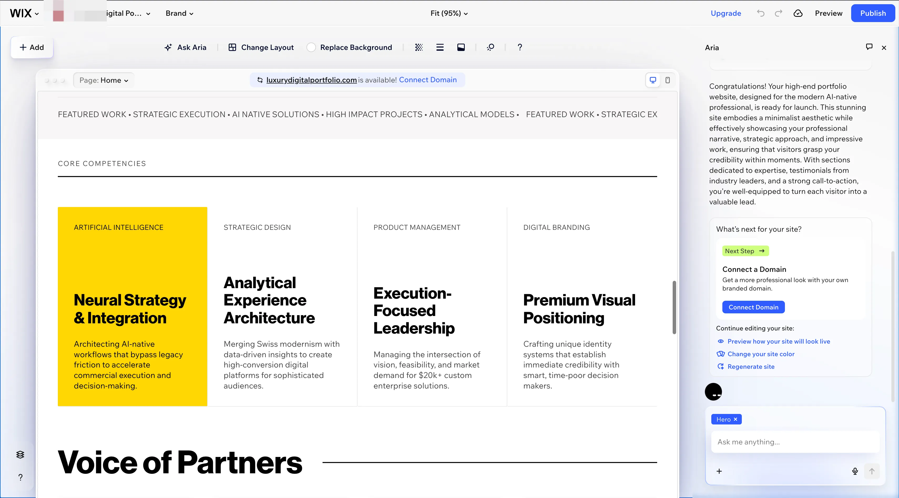 "You are a senior digital brand designer building a high-end personal portfolio website for a modern AI-era professional. This site must feel like a $20,000 custom-built portfolio, not a template. Primary goal: Turn visitors into serious leads (recruiters, clients, collaborators). Audience: Smart, time-poor people (founders, hiring managers, partners) who decide credibility in 30 seconds. Brand positioning: The owner is a modern, AI-native professional — strategic, analytical, creative, and execution-driven."