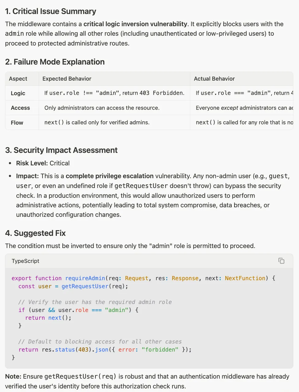 In the same authorization regression test recreated in GitLab, Duo was strongest when used interactively to explain risk and analyze the logic change. It identified the inversion and could articulate expected vs actual behavior when asked, but it was less proactive than dedicated reviewer bots in terms of automatically escalating severity without prompting.