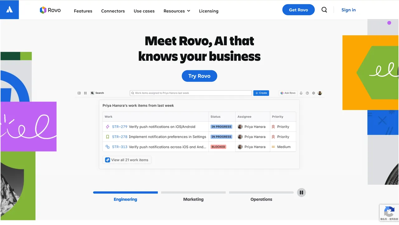 Atlassian Rovo is an AI layer built into the Atlassian ecosystem. Rather than functioning as a standalone code review bot, it acts as a business-aware assistant across Jira, Confluence, and Bitbucket.