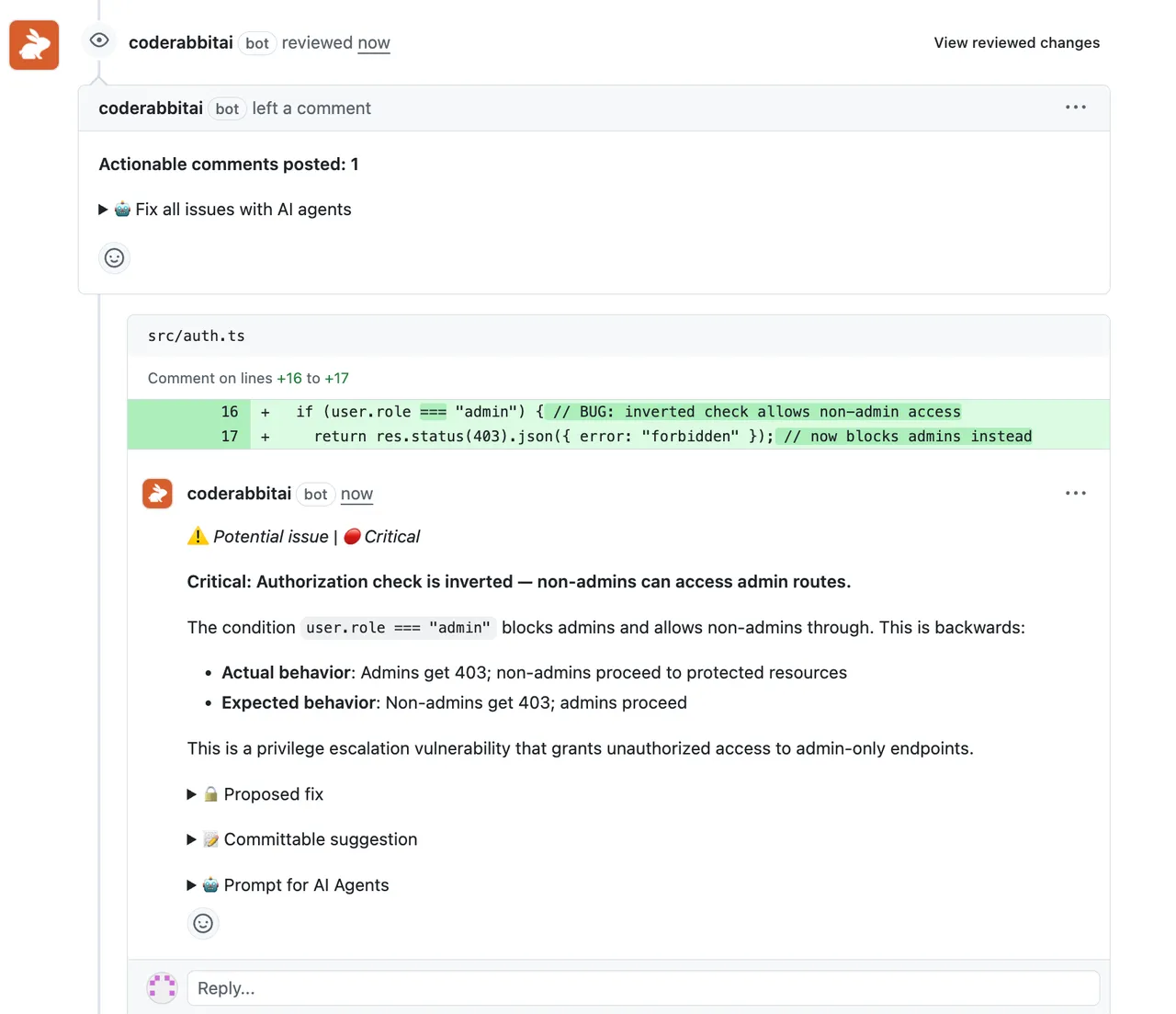 In the authorization inversion regression test, CodeRabbit correctly flagged the core access-control failure and explained the security impact in clear terms.