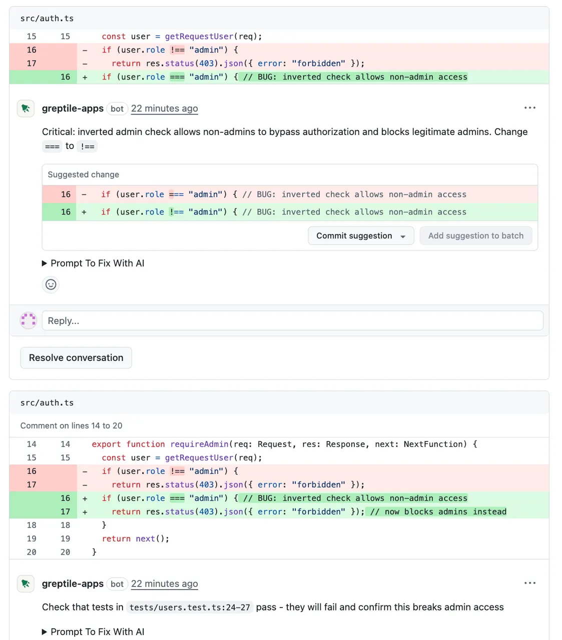 Greptile integrates directly into GitHub pull requests and posts structured review comments automatically. In our high-risk regression test involving an inverted authorization check, it flagged the control-flow issue clearly, explained the privilege escalation risk, and suggested a minimal fix. The PR-native workflow makes benchmarking realistic because feedback appears directly in the review thread.