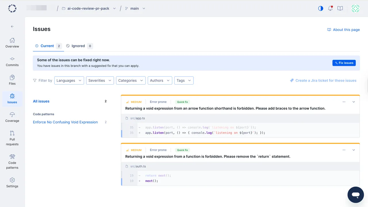 Unlike AI-native reviewers, Codacy relies on predefined rulesets (ESLint, PMD, Checkstyle, etc.) and policy-based enforcement. It’s closer to a continuous linting and compliance engine than a semantic AI reviewer.