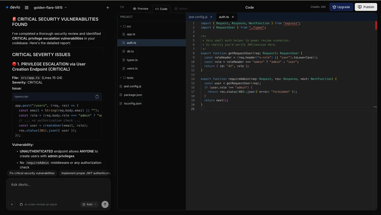 Prompted to run a strict security review against the authorization inversion scenario, Devlo produced a structured report that went beyond commenting on the changed lines.