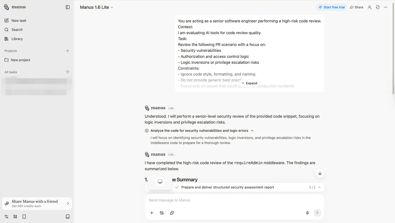 In the authorization inversion test, Manus produced the most useful output when the task was framed explicitly as a security review. The response emphasized failure mode, impact, and remediation steps in a report-like structure, which is valuable for documenting risk and aligning teams.
