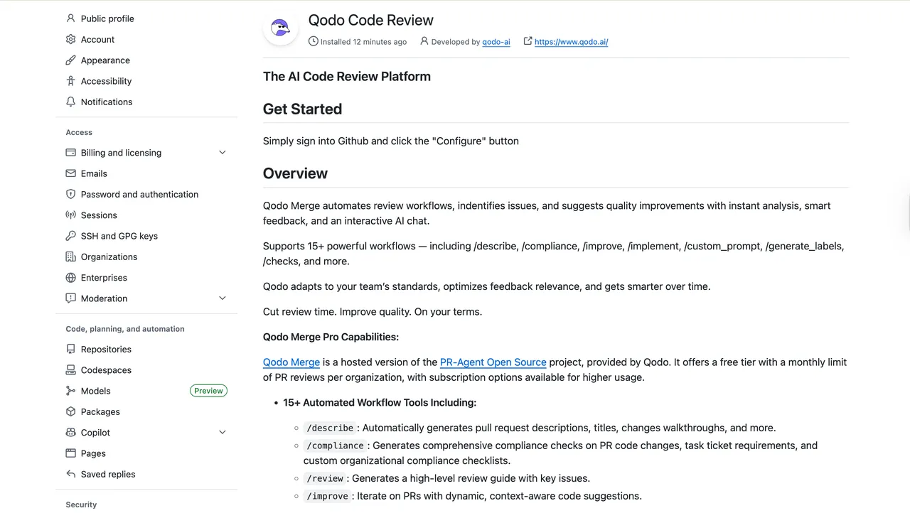 Qodo (Qodo Merge, based on the open-source PR-Agent) is an AI code review assistant that lives inside your PR workflow. It can generate PR summaries, review code changes, suggest improvements, and answer questions via PR comments (e.g., /review, /describe, /improve, /ask). It supports multiple execution modes: GitHub App (hosted), GitHub Action, and other git providers/webhooks depending on setup.