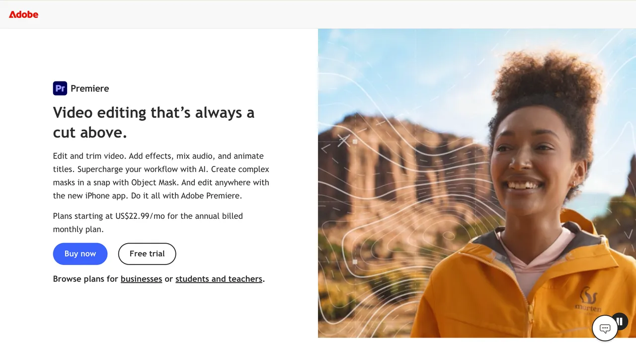 Adobe Premiere price: $19.99/mo for the annual billed monthly plan for the first year.