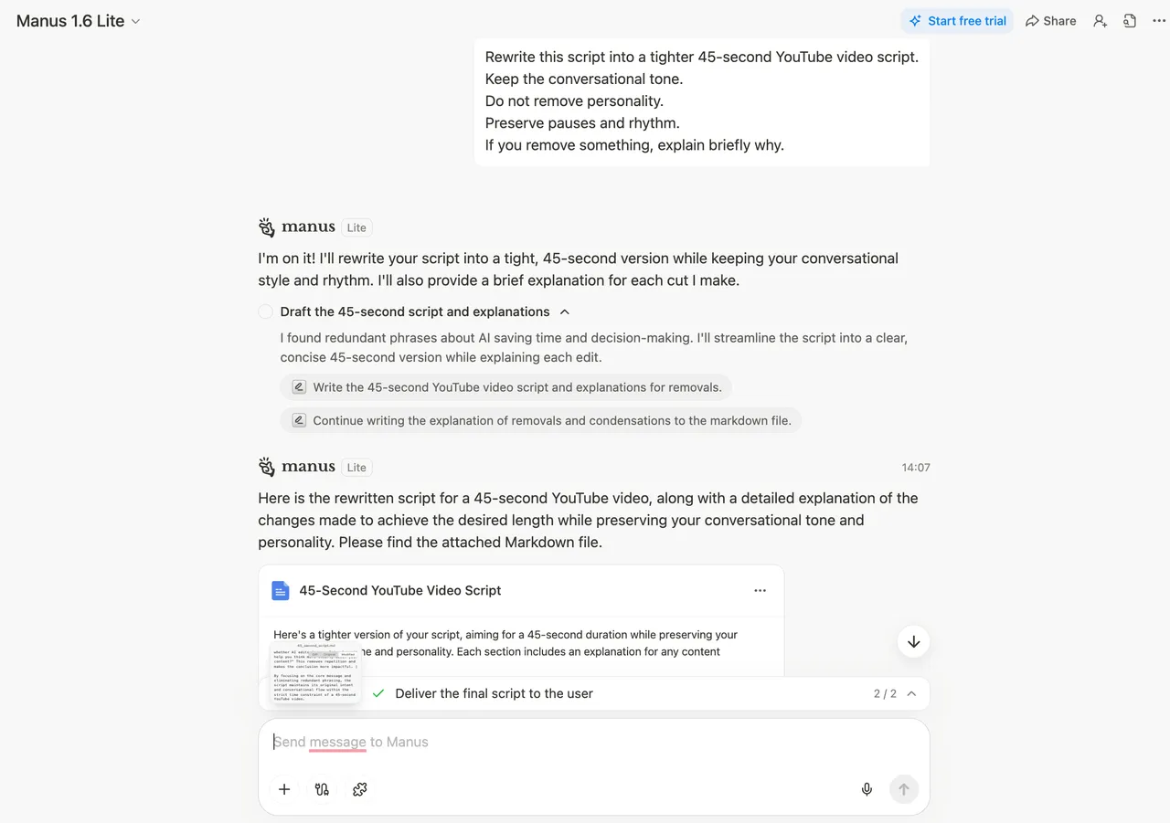 The first two rounds revealed strong structural editing logic. Manus effectively identified repetition and reorganized the script into a tighter version, though it prioritized conciseness over performance rhythm.