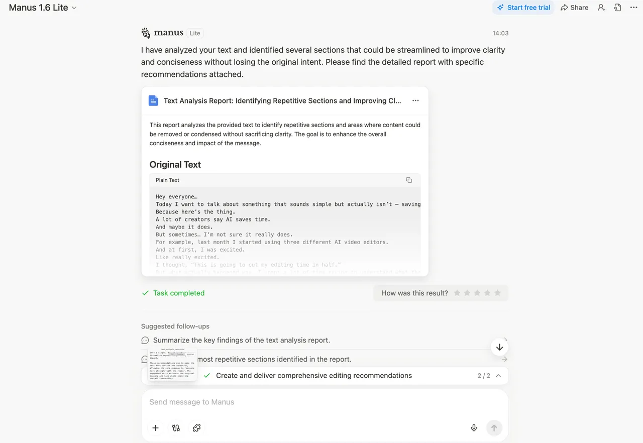 I ran three separate tests with Manus: redundancy detection, script compression, and short-form visual direction.