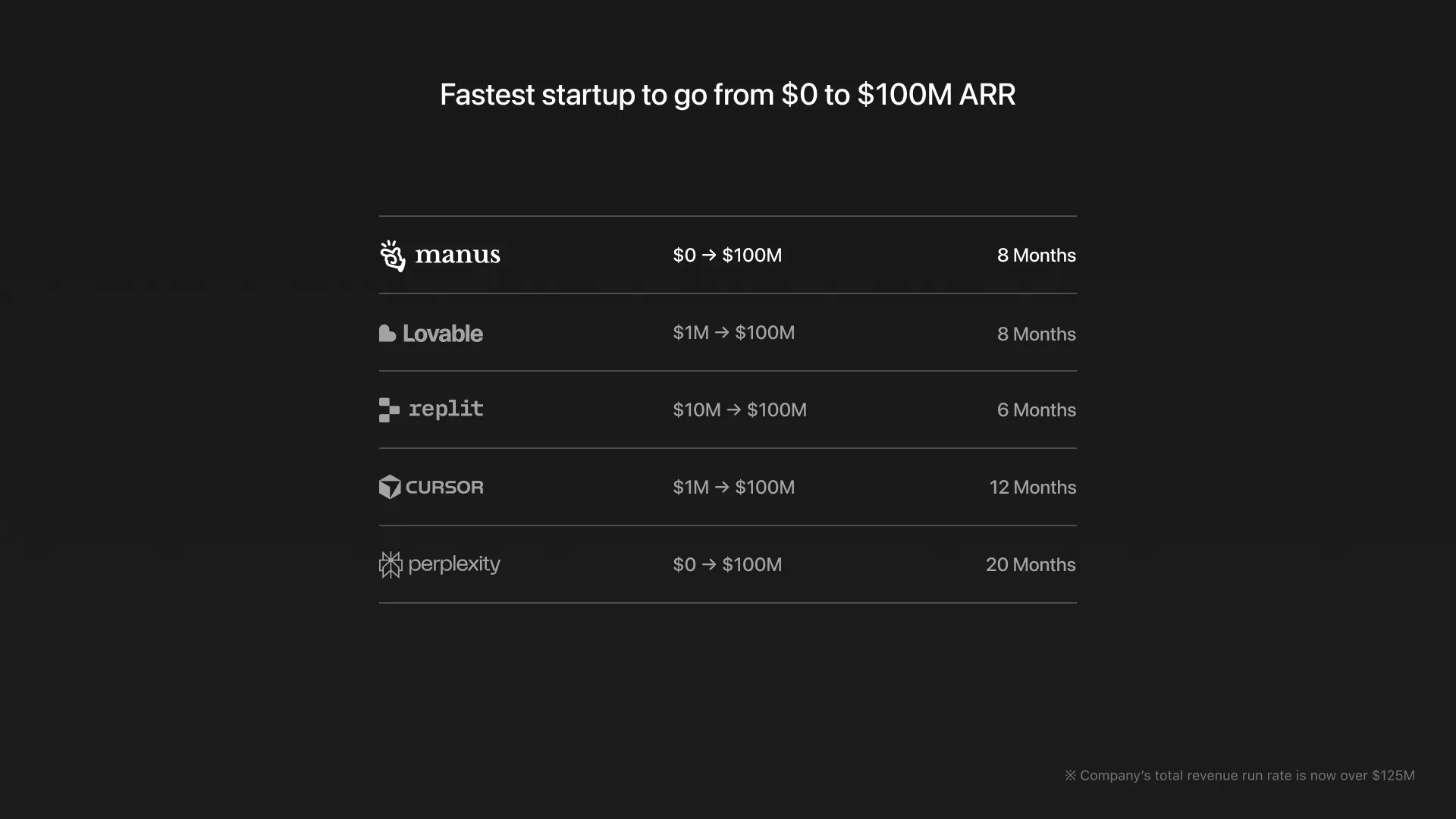 Manus has crossed $100M in ARR, eight months after launch. This makes us the fastest startup to go from $0 to $100M in the world. Our company's total revenue run rate is now over $125M, including usage-based and other revenue. We've been growing at more than 20% month-over-month since the release of Manus 1.5, and we're continuing to accelerate our product and feature releases.