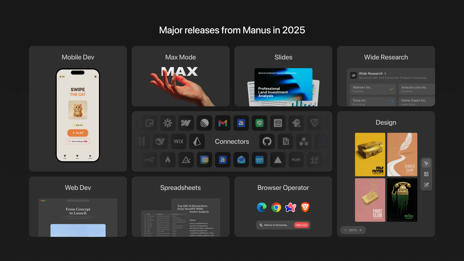 We shared our learning on Context Engineering for AI Agents, which became an industry standard. We released game-changing technical innovations like Wide Research, and made it possible to build mobile applications from natural language. All thanks to the millions of you around the world who choose to trust Manus for getting things done!