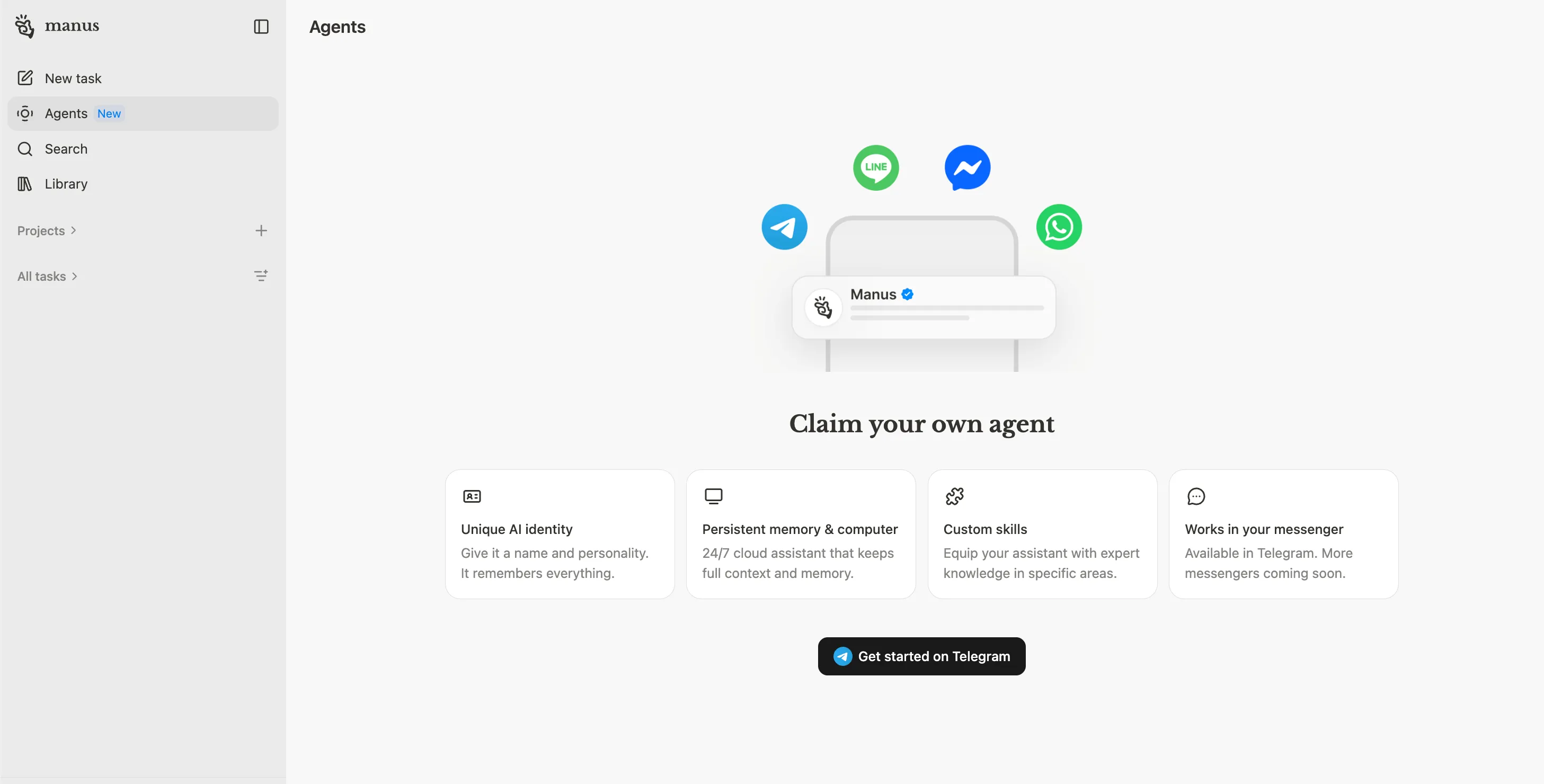 Today, we're introducing Manus Agents — a new way to access and use Manus directly inside your messaging apps. Telegram is the first supported channel. Manus Agents with Telegram support is available today to all users across all subscription tiers, with more platforms coming soon.