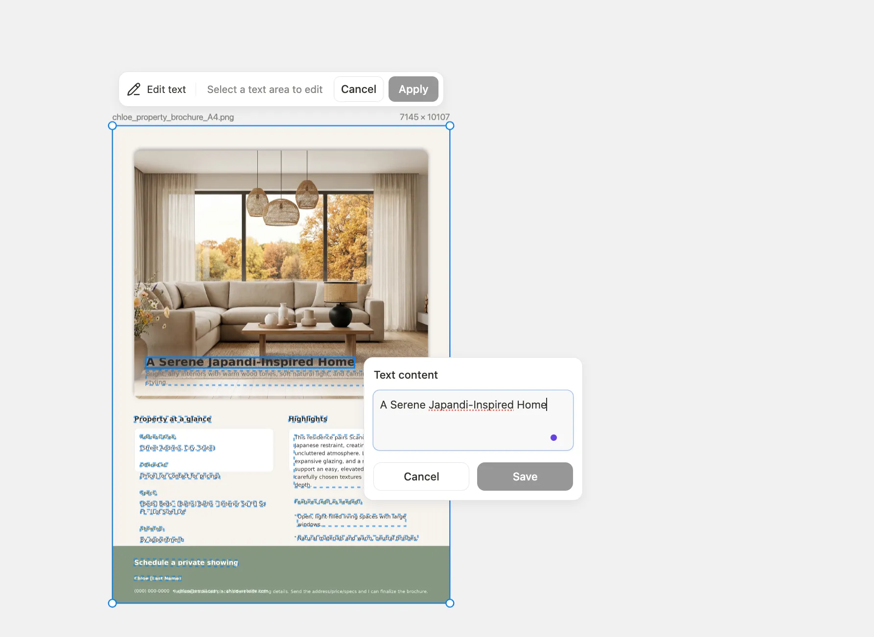 Chloe wants this to be on a poster, she creates a poster with this image, but needs to change the text. She clicks on "edit text" and Manus extracts all text elements, allowing Chloe to make text edits with ease.