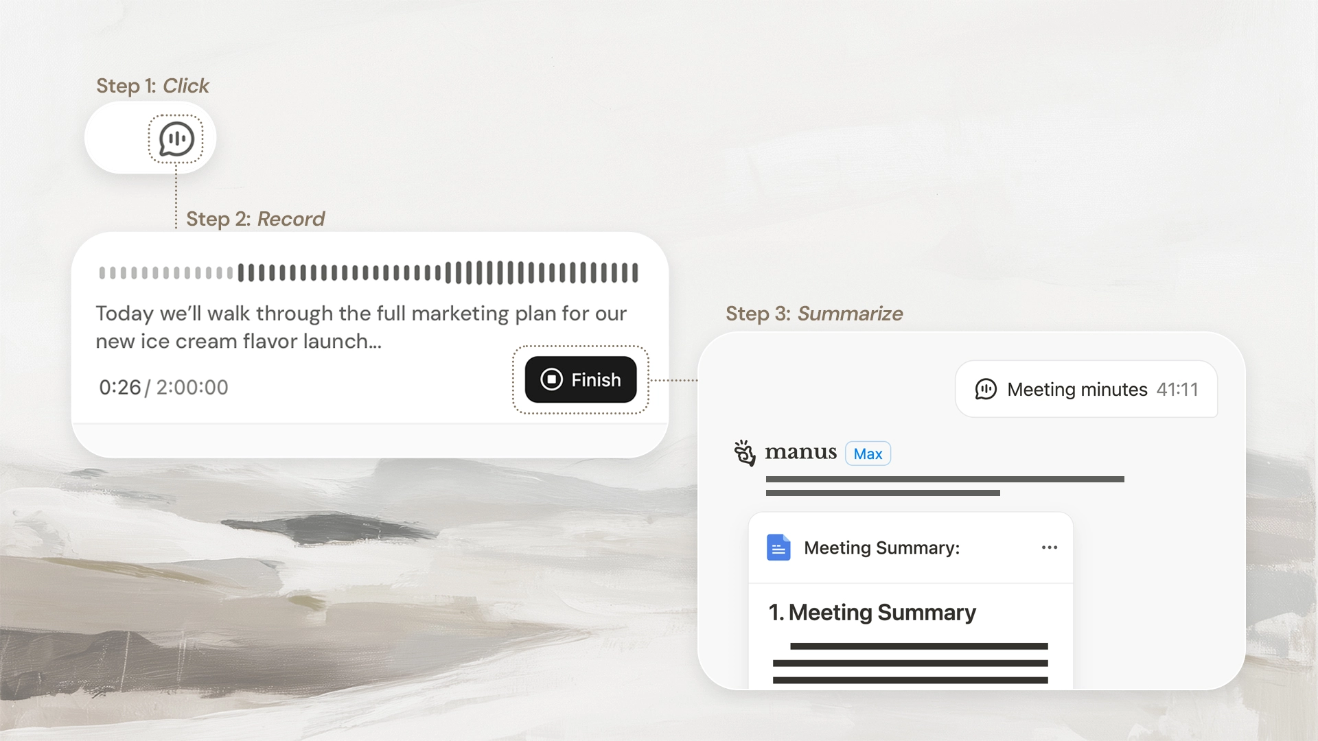 With a single tap, you can record any in-person meeting, interview, or monologue. Once you're done, Manus analyzes the conversation and delivers a structured summary of what matters: the key points, the attendees, and a clear breakdown of to-dos.