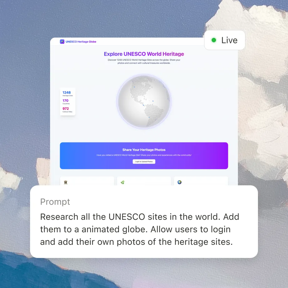Build anything — Landing pages, SaaS dashboards, or full web apps with logins and databases.