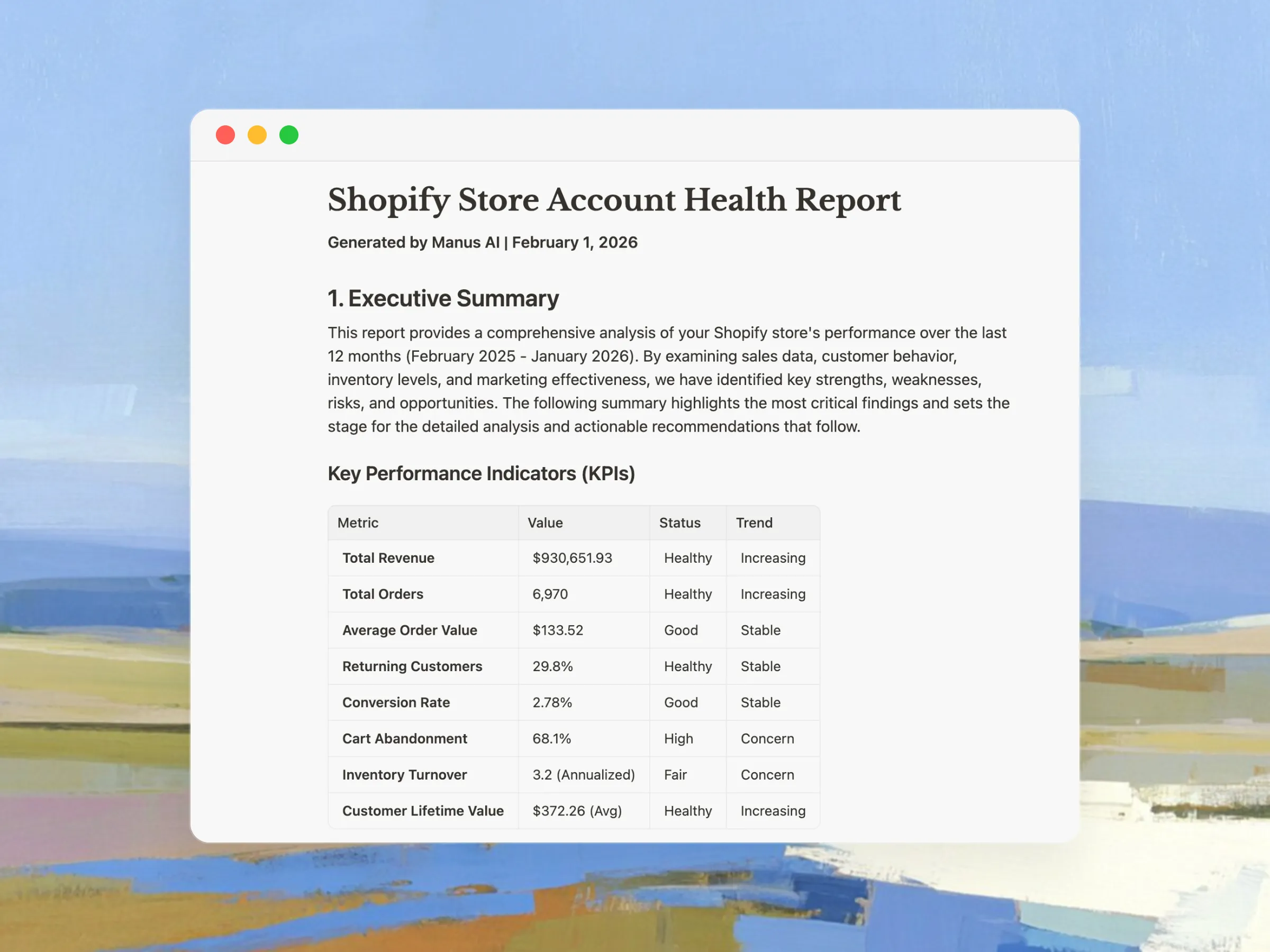 Manus's account health tool can analyze various account types including e-commerce stores (Amazon, Shopify, eBay), SaaS customer accounts, social media business accounts, and marketplace seller accounts. The AI adapts its analysis based on your specific account type and the metrics that matter most to your business.