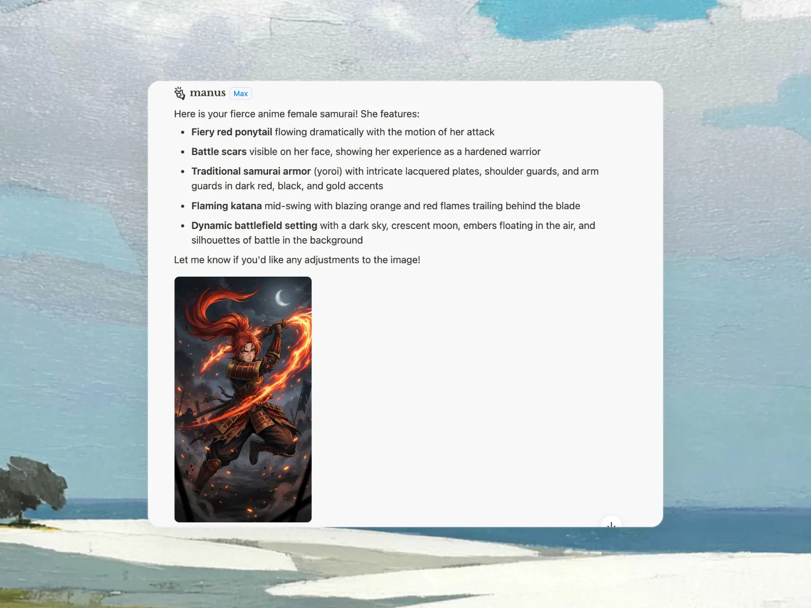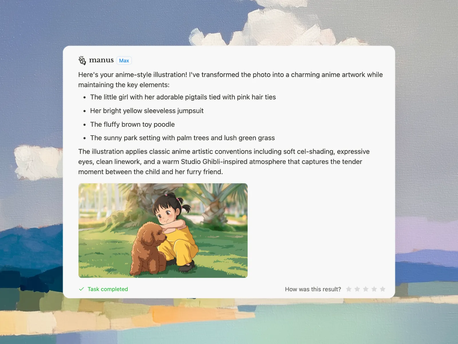 Using an AI anime generator is as easy as typing a description of the anime image you want to create. The more detailed your description, the more accurate the result will be. With Manus, you can also use our Design View to make specific edits to the generated anime image, giving you complete creative control.