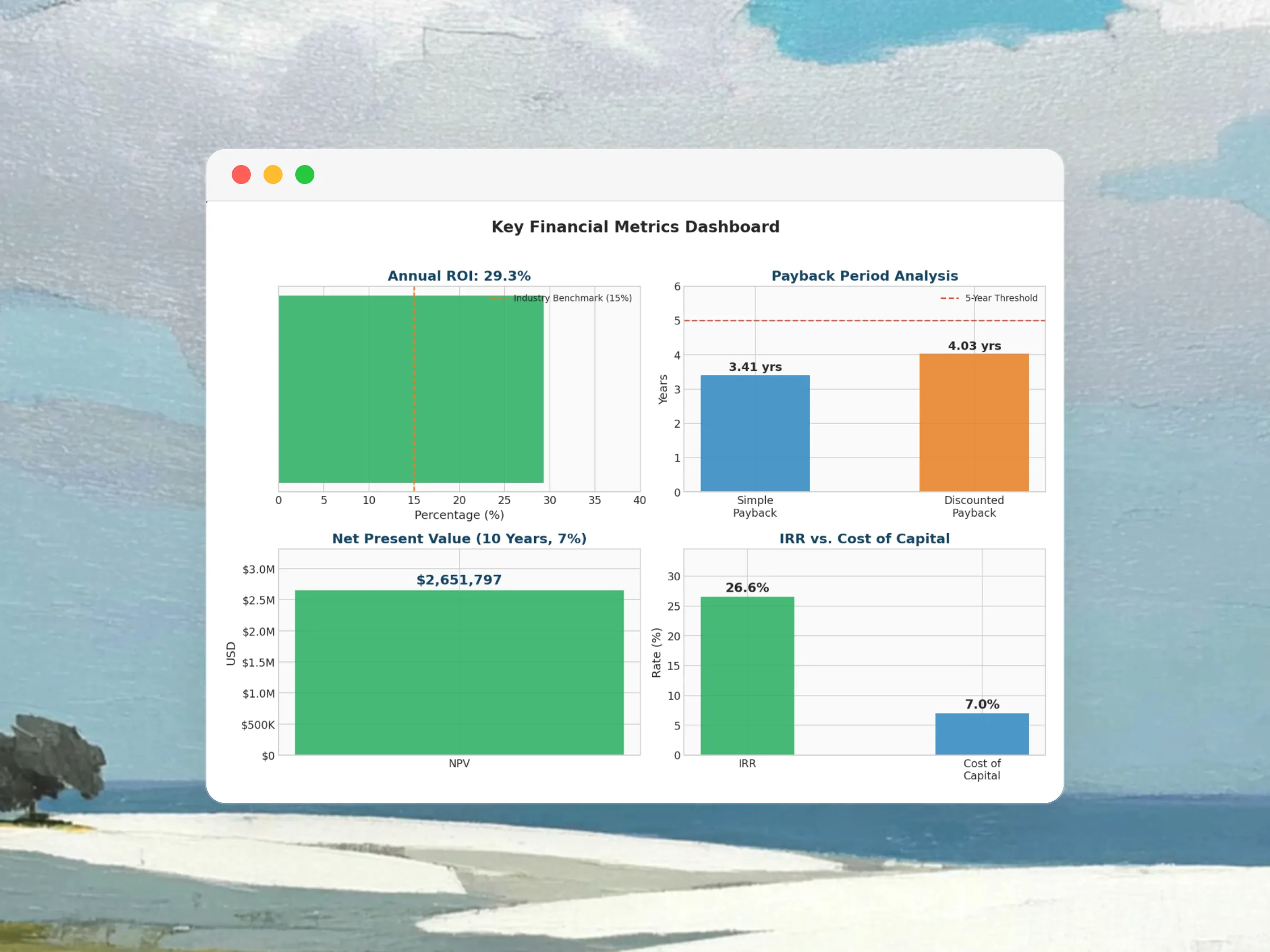 Most cost analyses are completed within 5 to 15 minutes, depending on complexity. A simple cost breakdown takes just a few minutes, while a comprehensive cost-benefit analysis with NPV calculations and detailed visualizations may take slightly longer. Either way, it's dramatically faster than manual spreadsheet work.