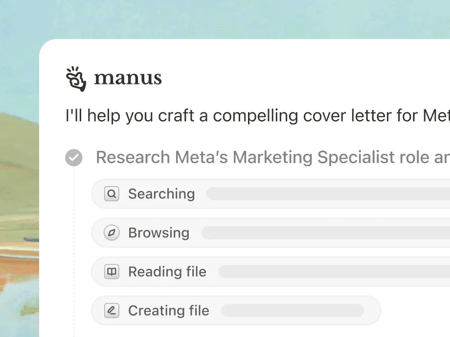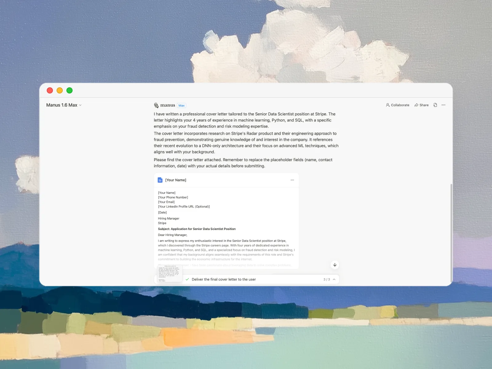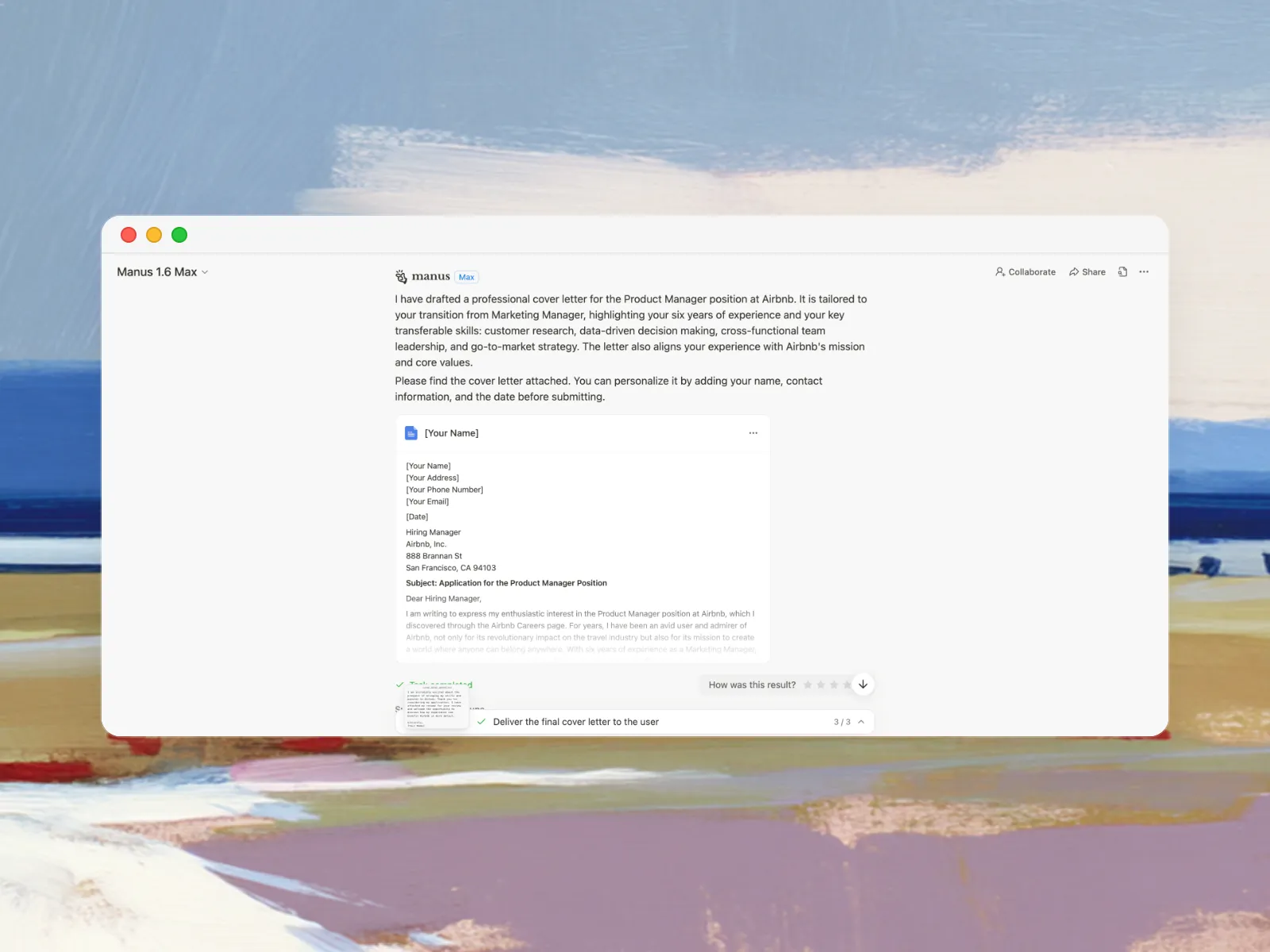 Manus AI is an excellent choice for your entire job application package. It can not only create research-driven cover letters but also help you refine your resume and even build a professional portfolio with our integrated AI website builder.