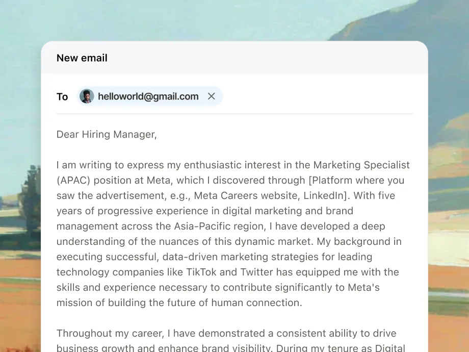 With Manus AI, you provide your resume and job target, and our AI agent handles the rest. It researches the company and role to create a personalized cover letter that goes far beyond generic templates, ensuring your application stands out. You can also use our AI resume builder to optimize your resume first.