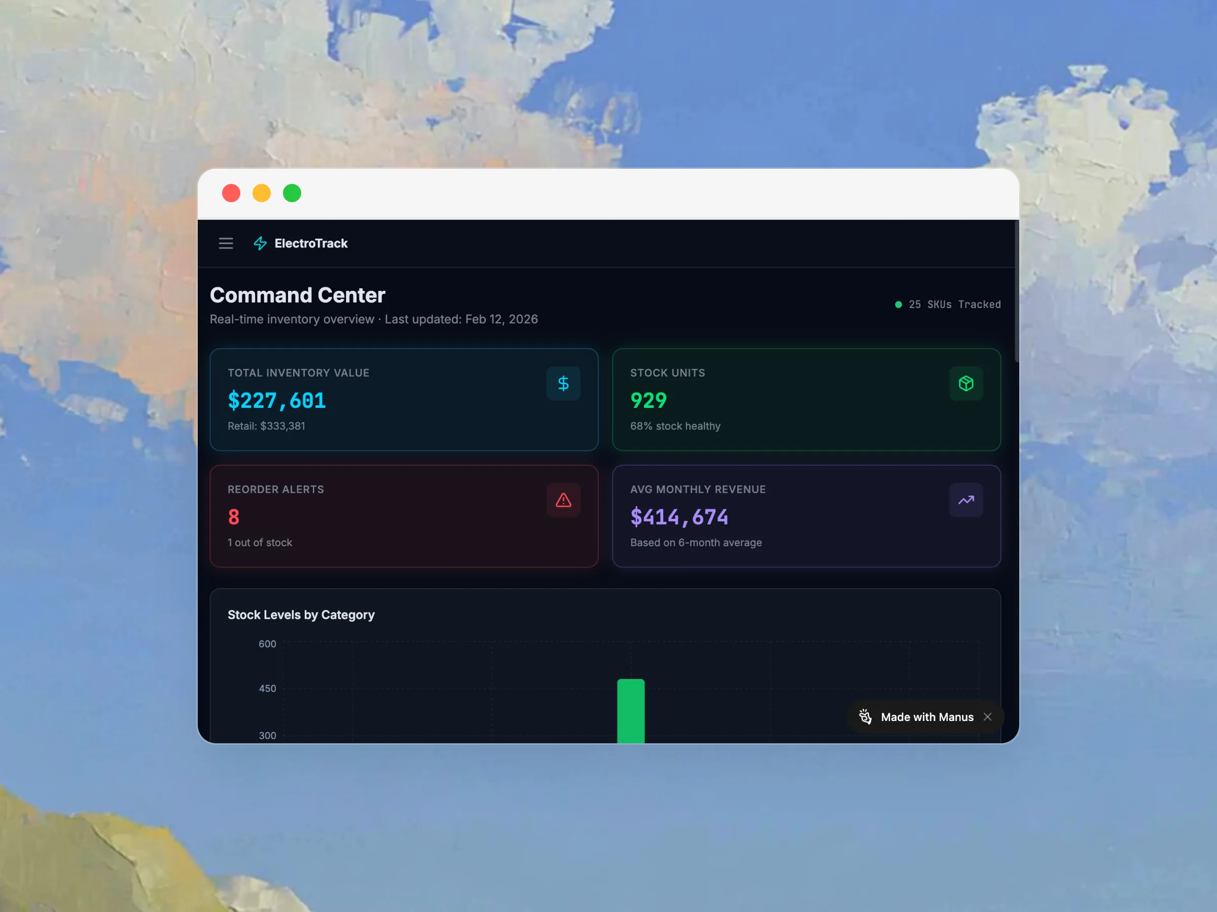 Manus creates interactive web-based dashboards with sortable tables, visual charts, automated reorder alerts, and demand forecasting. Unlike static templates, every system is custom-built for your specific business needs. The output is a live, shareable web application—not just a document or spreadsheet.