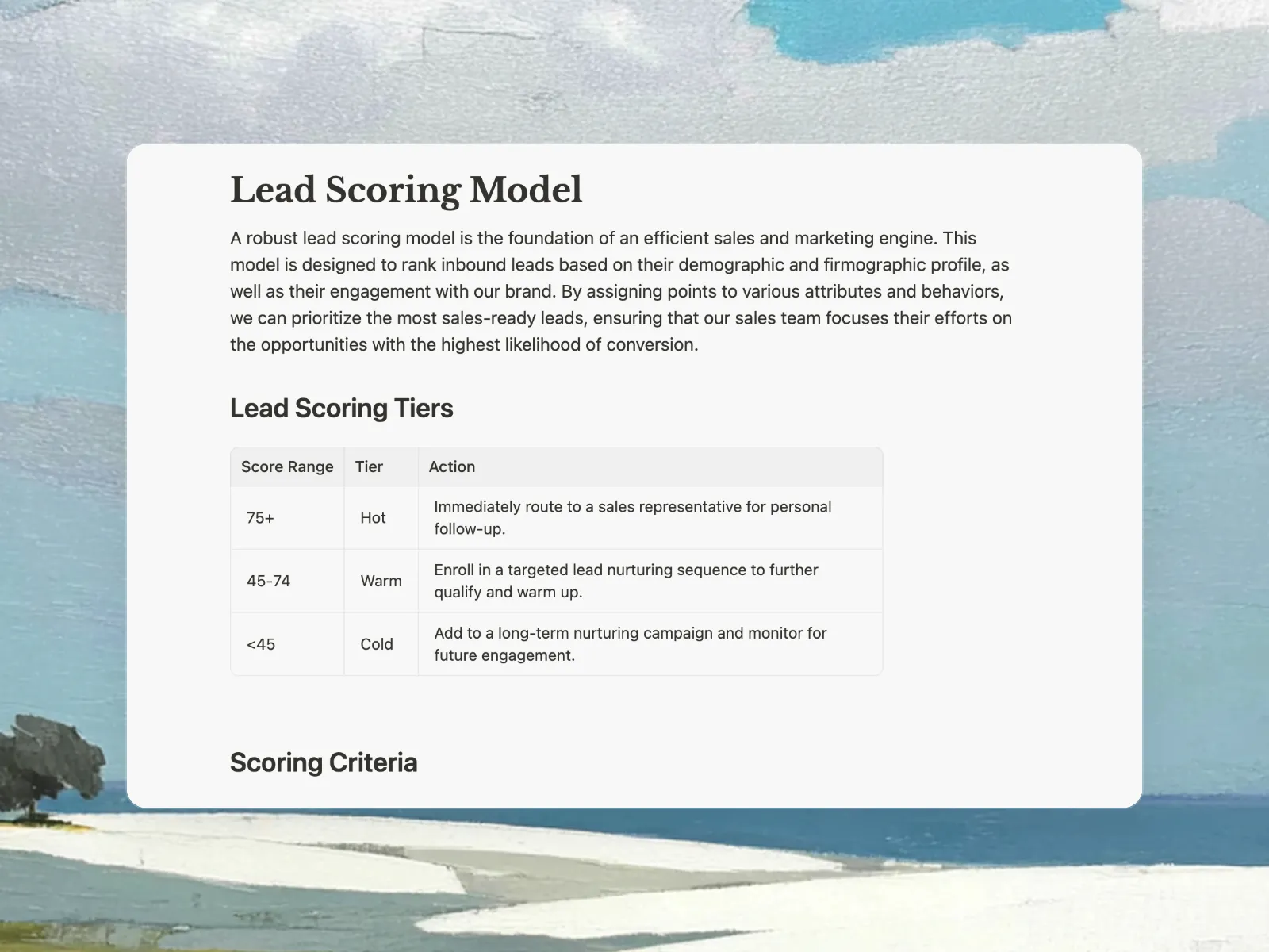 Manus creates comprehensive lead management systems including lead scoring models with specific criteria and point values, qualification frameworks like BANT, automated routing rules, nurturing email sequences, follow-up cadences, and performance dashboards. Everything is customized to your specific business and industry.