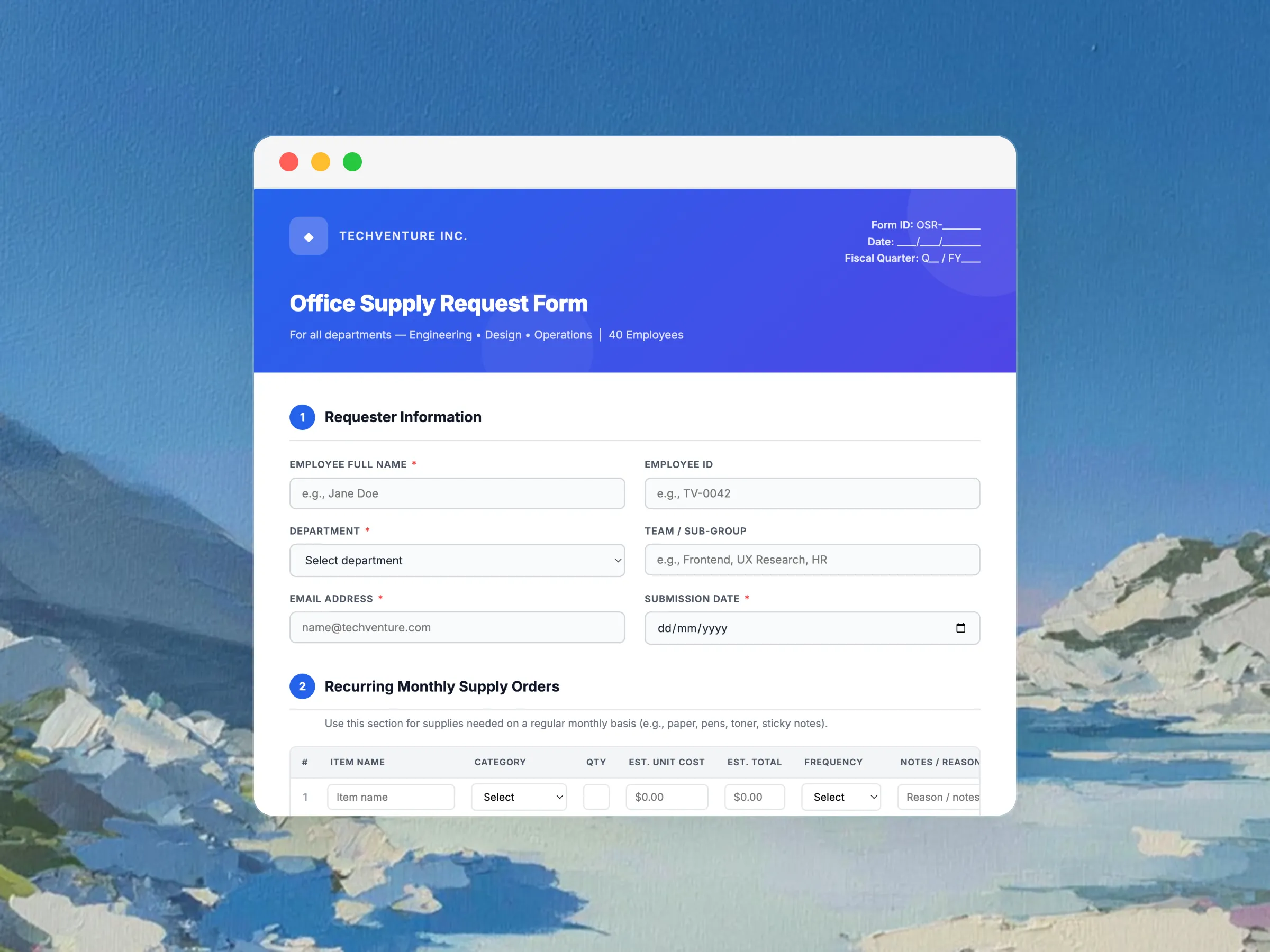 Stop chasing down supply requests. Generate a streamlined office supply request form in minutes, tailored to your team.