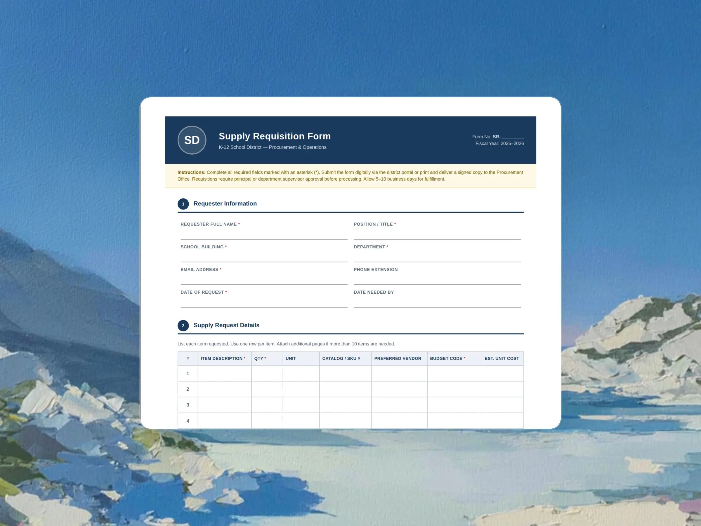 Our AI analyzes your description to understand the context, department needs, and approval workflows required. It draws on best practices from thousands of business forms to generate a professional supply request form tailored to your situation.