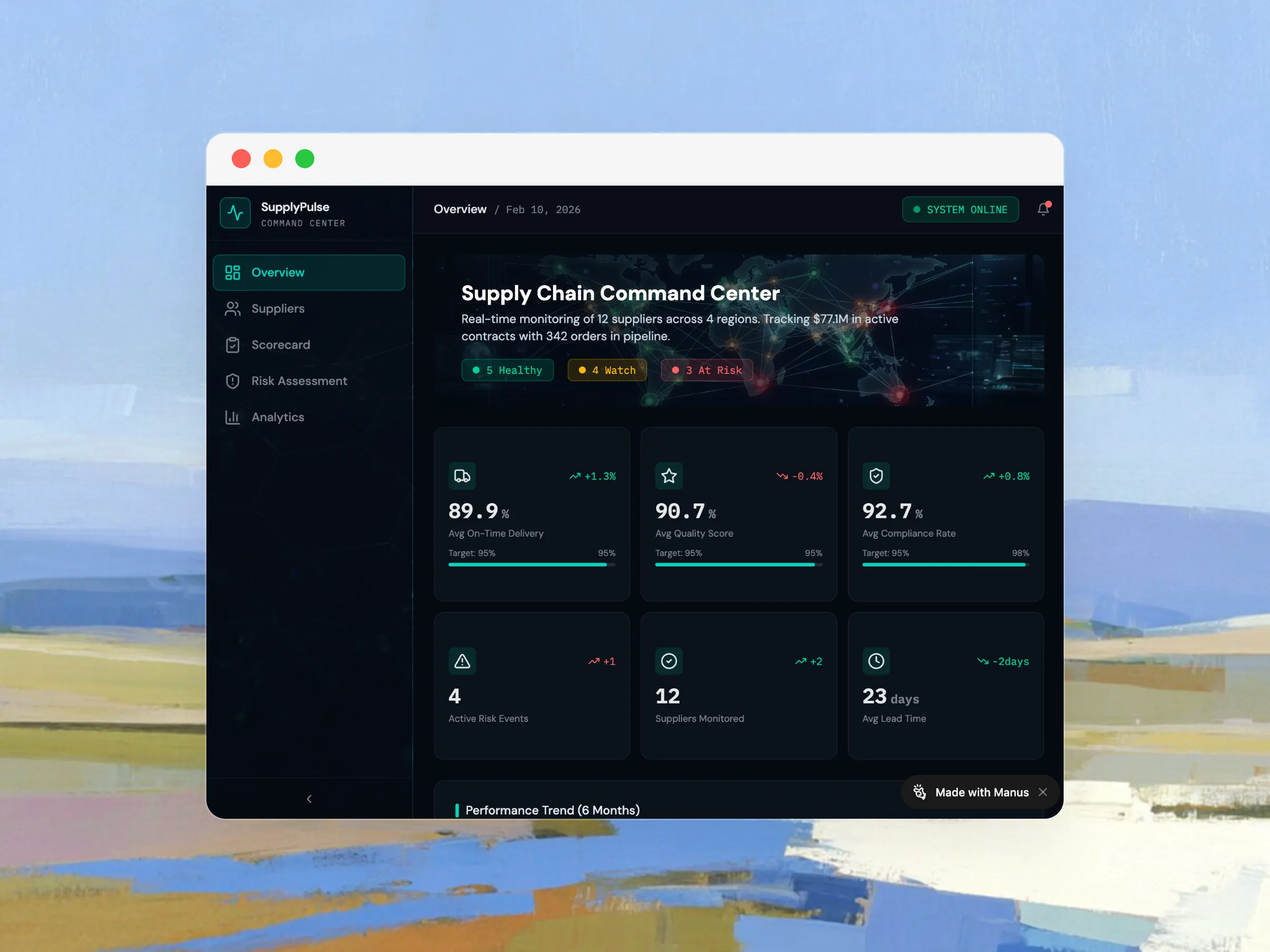 Yes, the procurement dashboard scales from tracking a handful of local vendors to managing hundreds of global suppliers. Manus structures the data to handle large supplier portfolios with filterable views, so you can drill down by region, category, or performance tier. For vendor evaluation, pair it with our SWOT analysis generator.