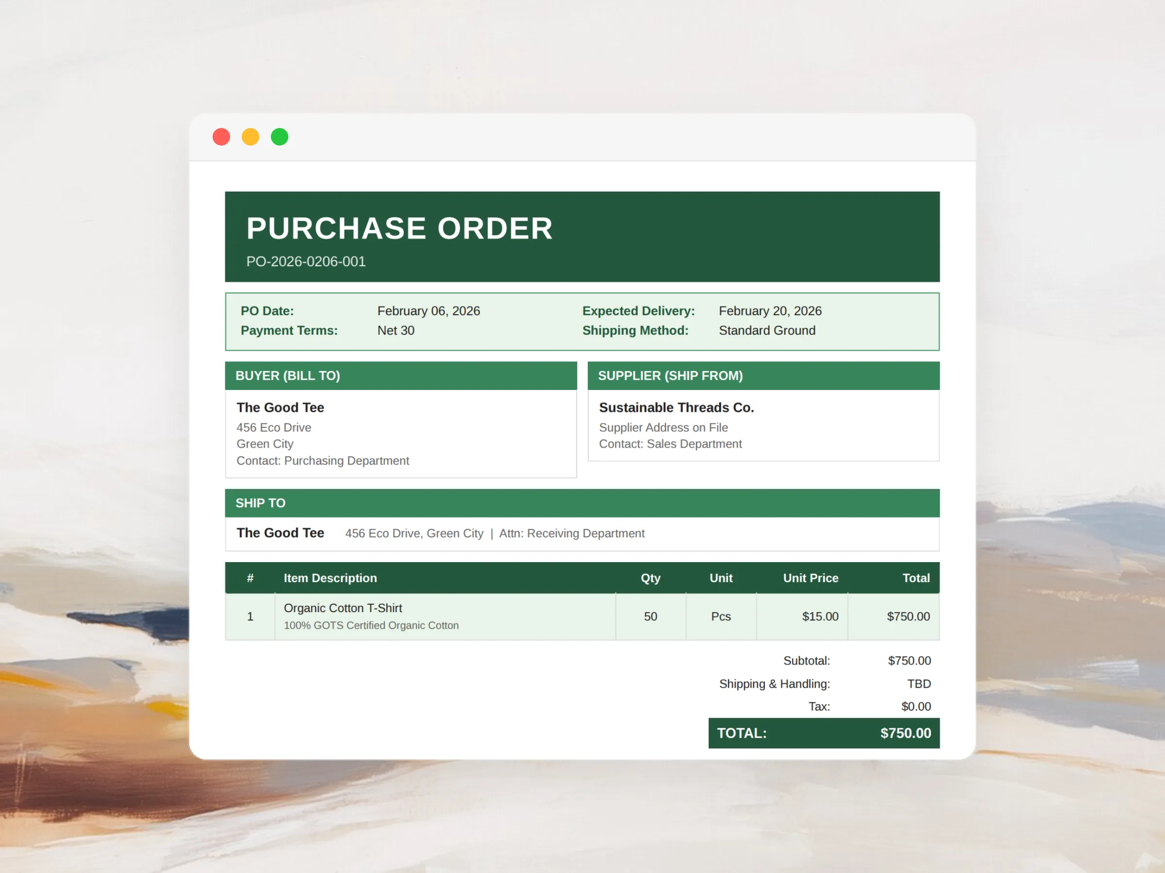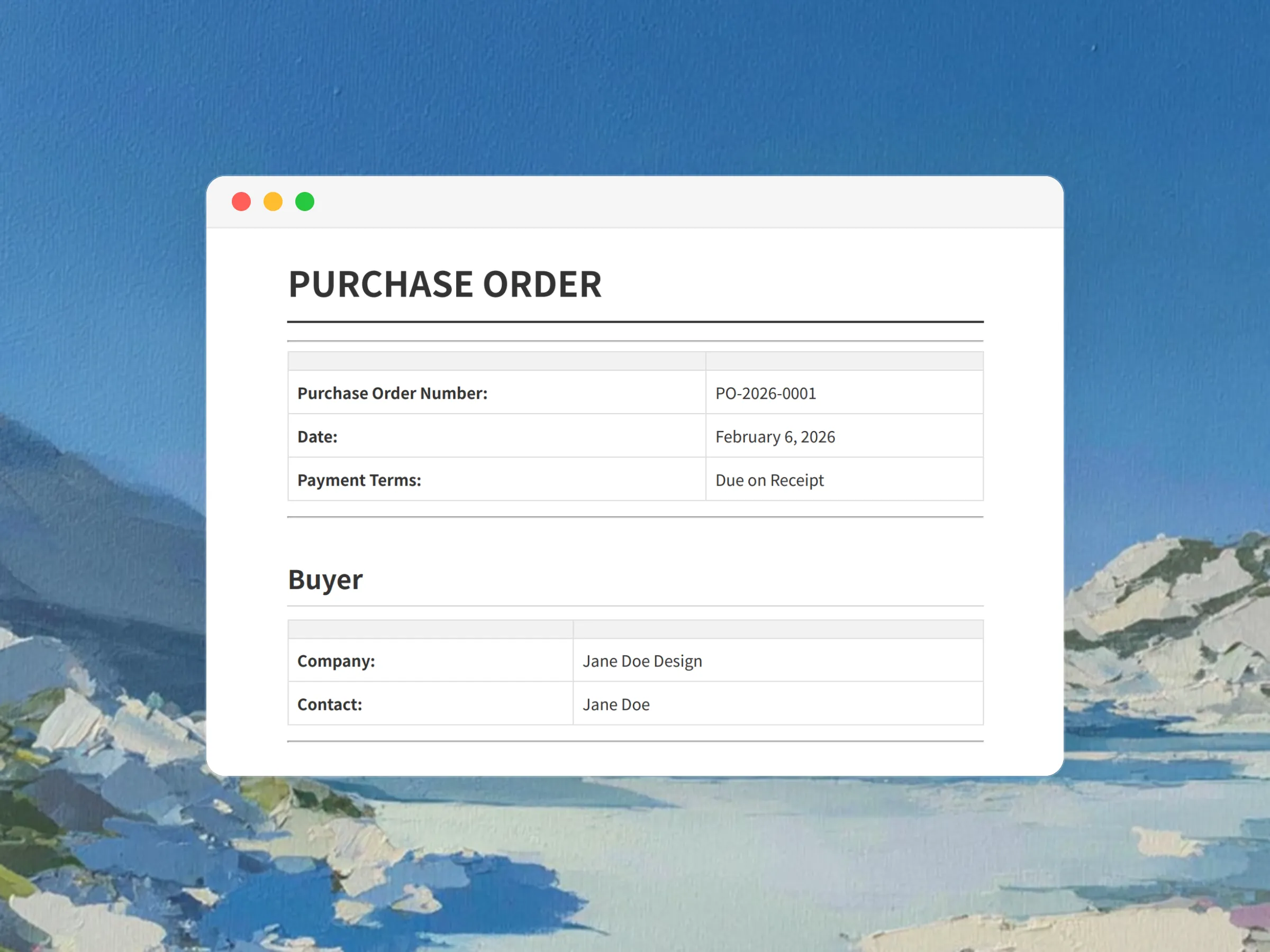 Stop wrestling with spreadsheets and templates. Describe your order details, and Manus generates a professional purchase order instantly.
