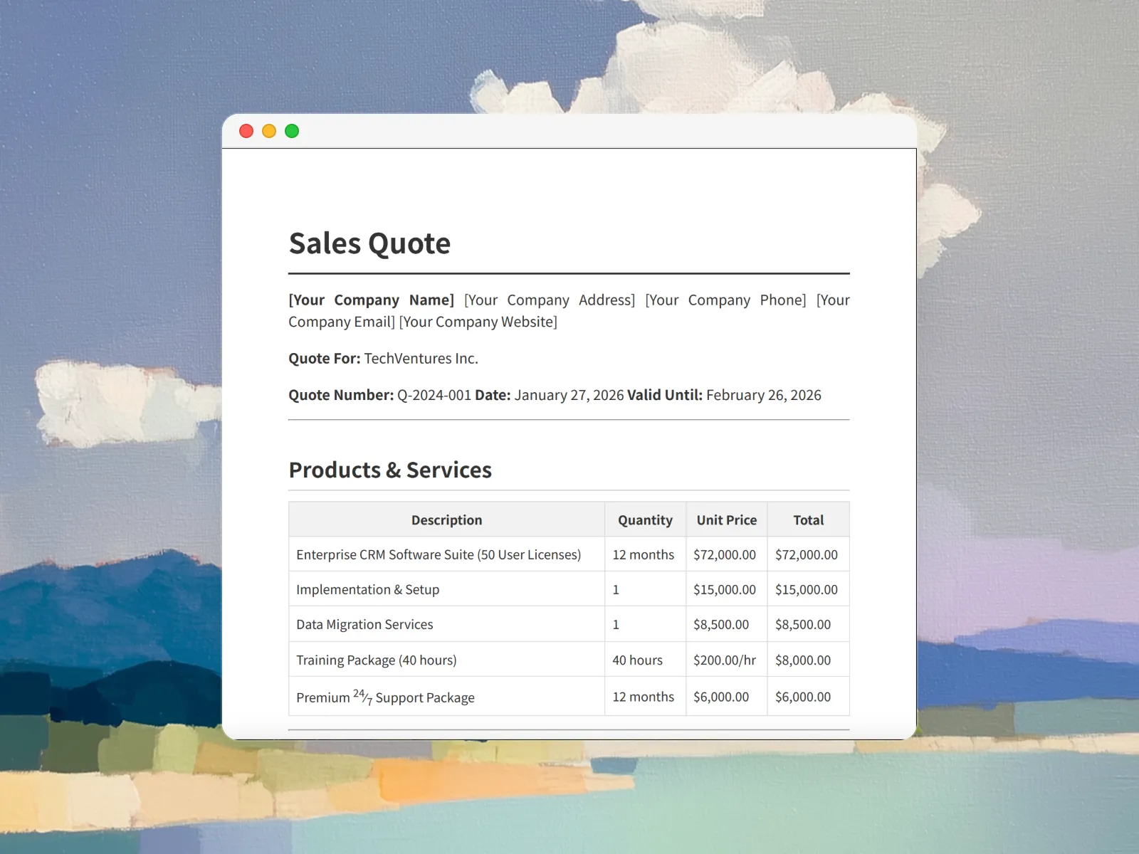 Professional sales quotes typically take just 2-3 minutes to generate. Complex quotes with multiple line items, custom calculations, and detailed terms may take slightly longer. This compares to the 30-60 minutes most sales teams spend manually creating similar documents.