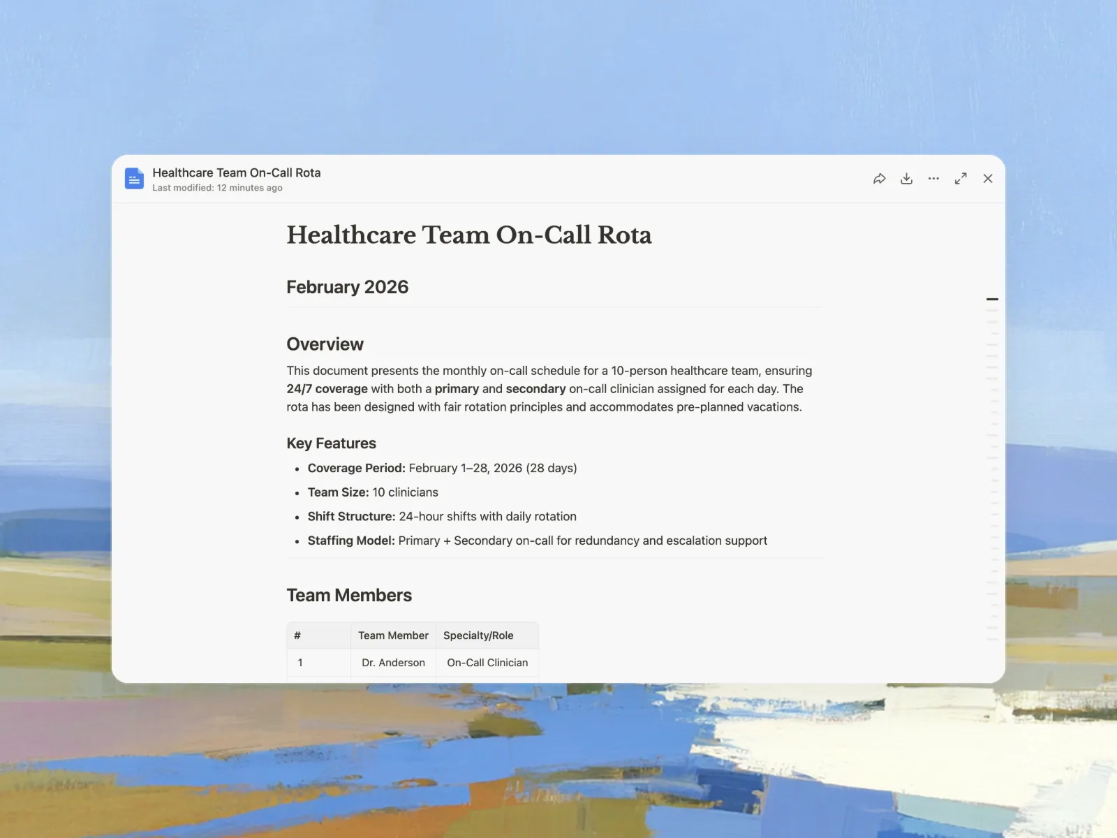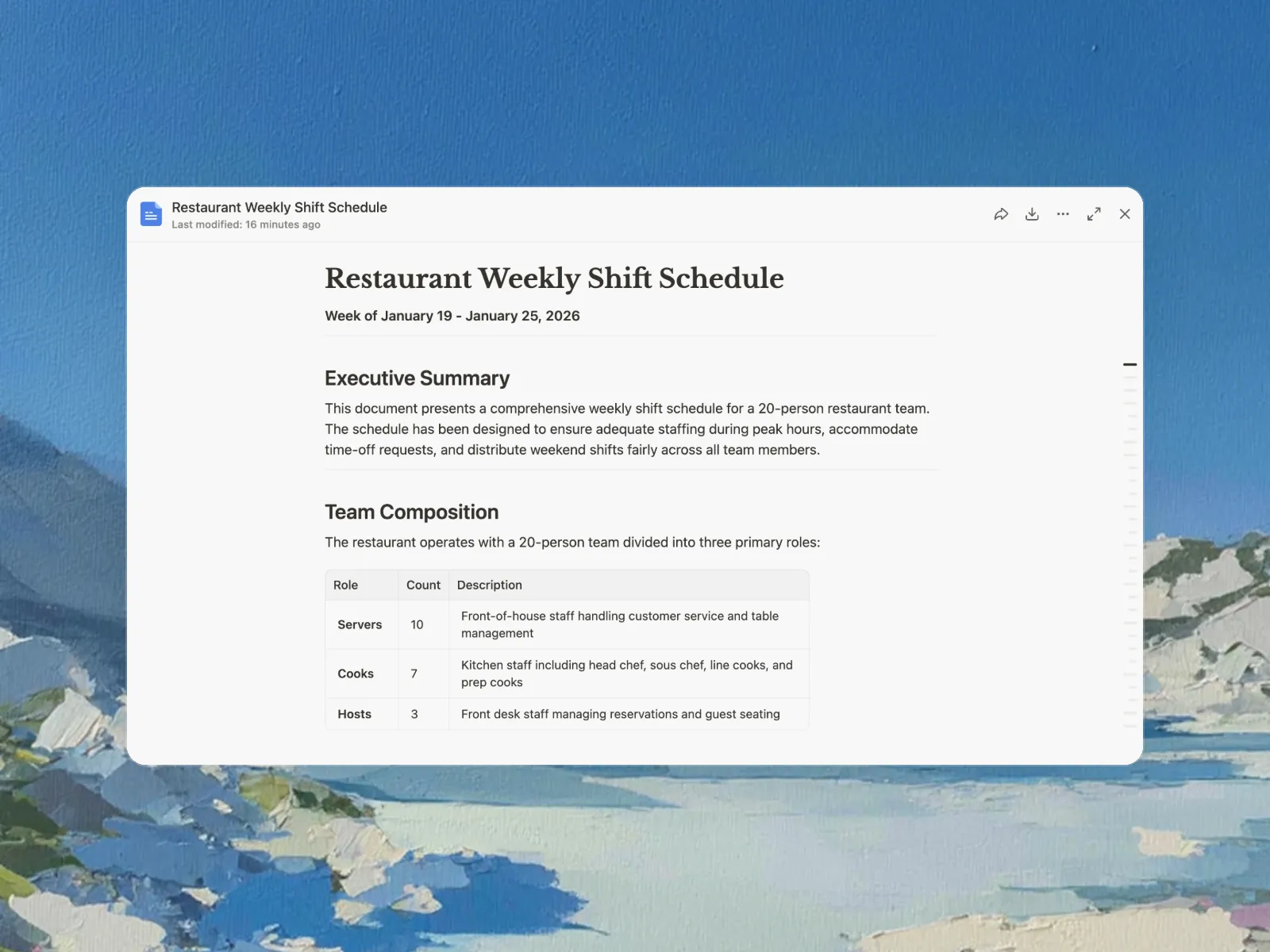 Absolutely. You can provide a list of employees and their availability, and Manus will create a schedule that respects everyone's time-off requests and availability. This helps to reduce scheduling conflicts and improve employee satisfaction. Manage your team roster with our employee directory generator.