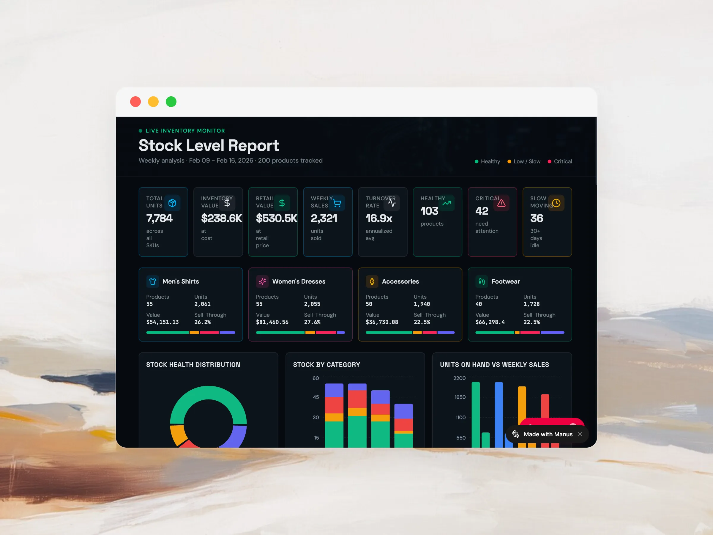 Monitor stock levels, spot shortages before they happen, and get reorder recommendations with Manus AI.