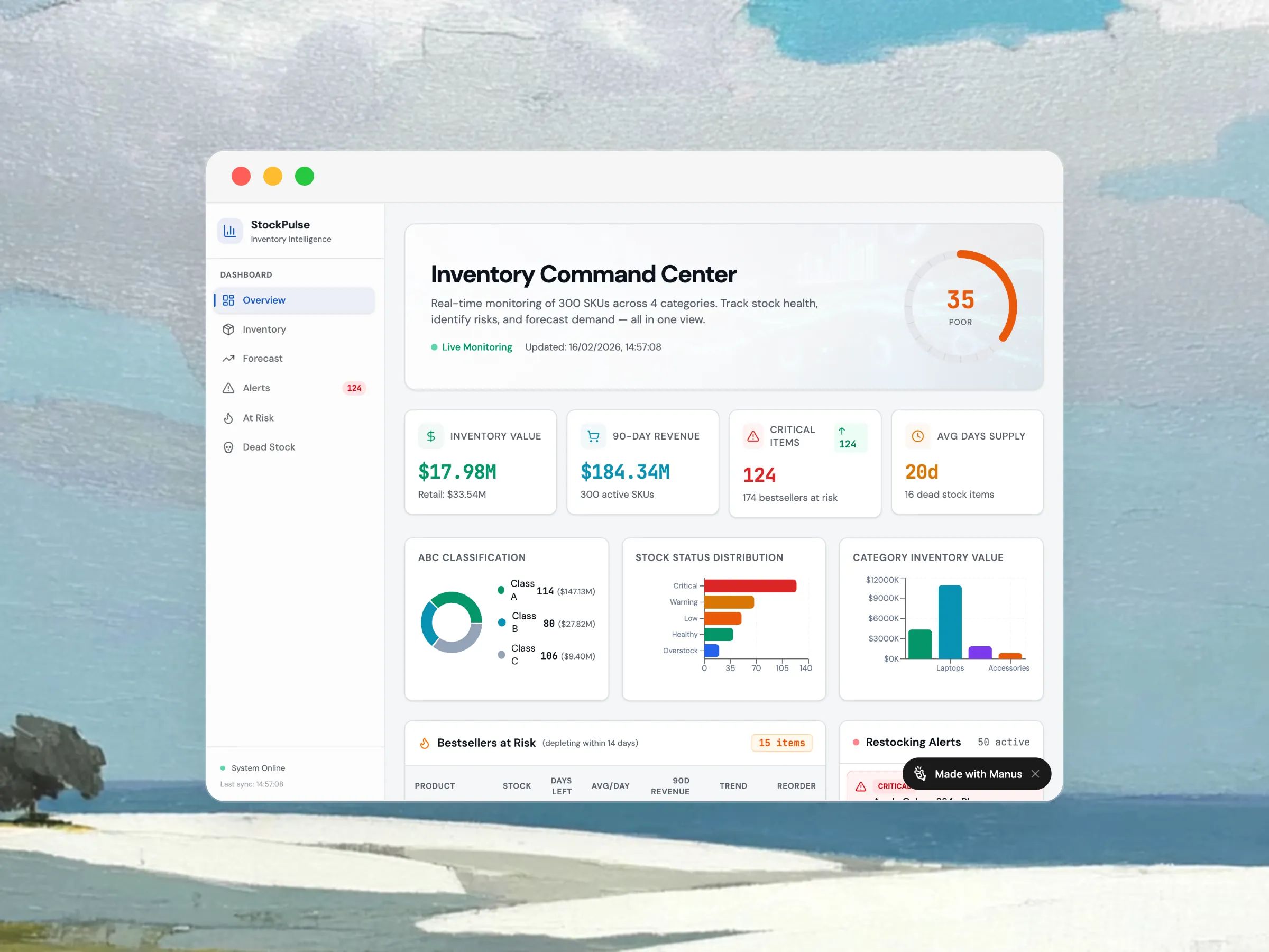 Manus bases reorder points on your actual sales velocity, lead times, and safety stock calculations. The recommendations are data-driven and grounded in established supply chain formulas. For best results, provide at least three months of sales history. We recommend pairing AI insights with your own domain knowledge for final purchasing decisions.