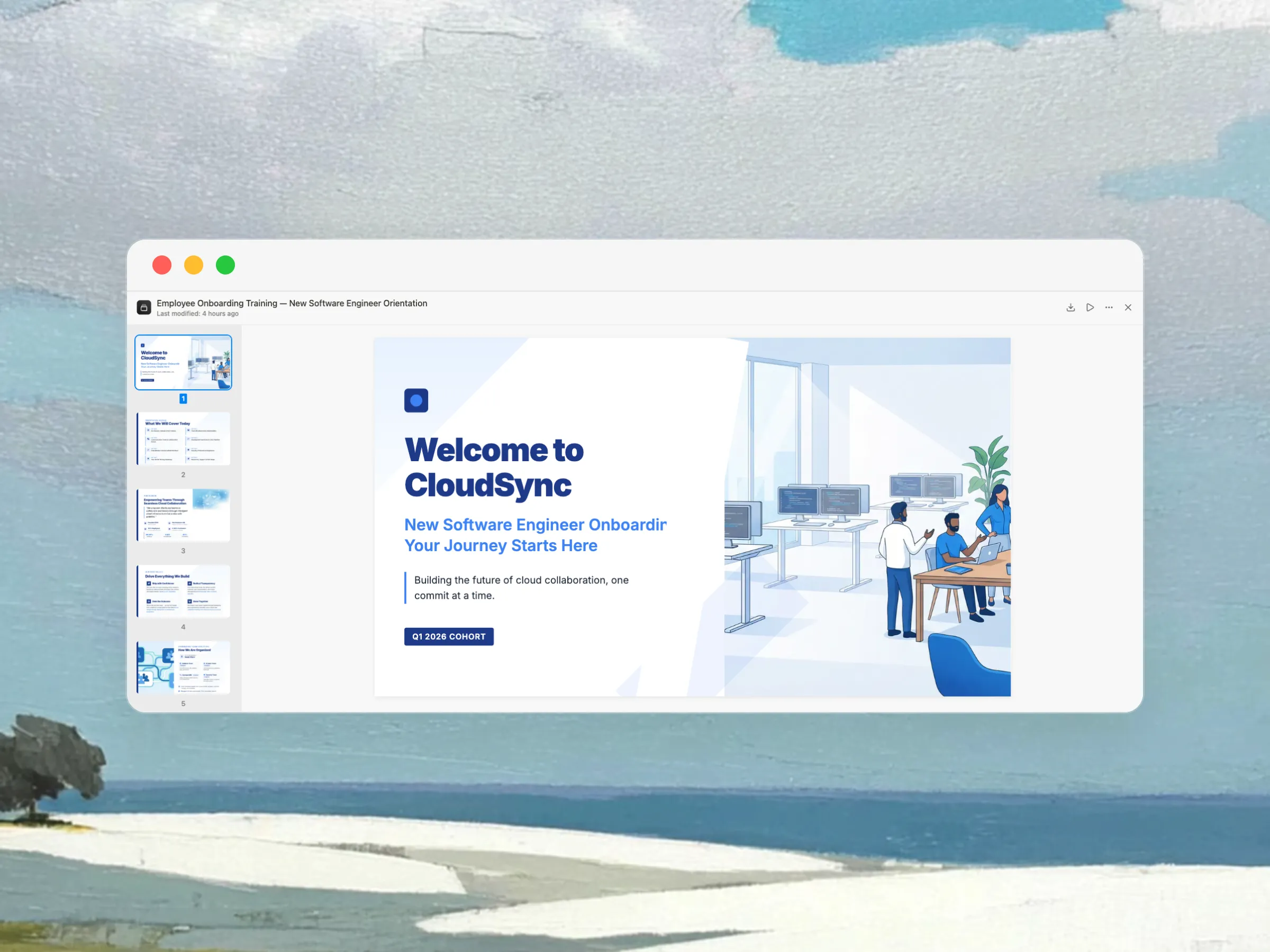 Most training presentations with 10 to 15 slides are generated in about 5 to 8 minutes. More complex decks with extensive research, such as a 30-slide compliance training program or a multi-module onboarding series, may take up to 15 minutes. This is a fraction of the hours or days it typically takes to build training materials manually.