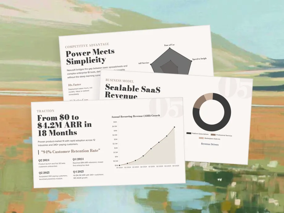 Impress investors with a data-driven pitch deck generator. Manus researches market size, analyzes competitors, and creates compelling charts to validate your business case.